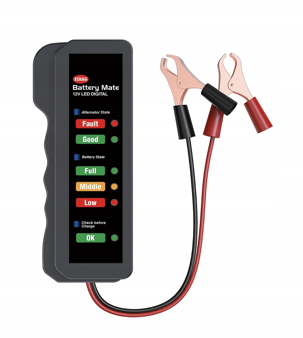 - Проверка генератора + батарея батареи: проверка генератора ускоряет двигатель до 2000 об/мин, когда сияет зеленый свет, окружность зарядки в порядке. Батарея до 12 В. Проверка состояния автомобильной батареи с использованием 6 светодиодов, которые указывают на состояние