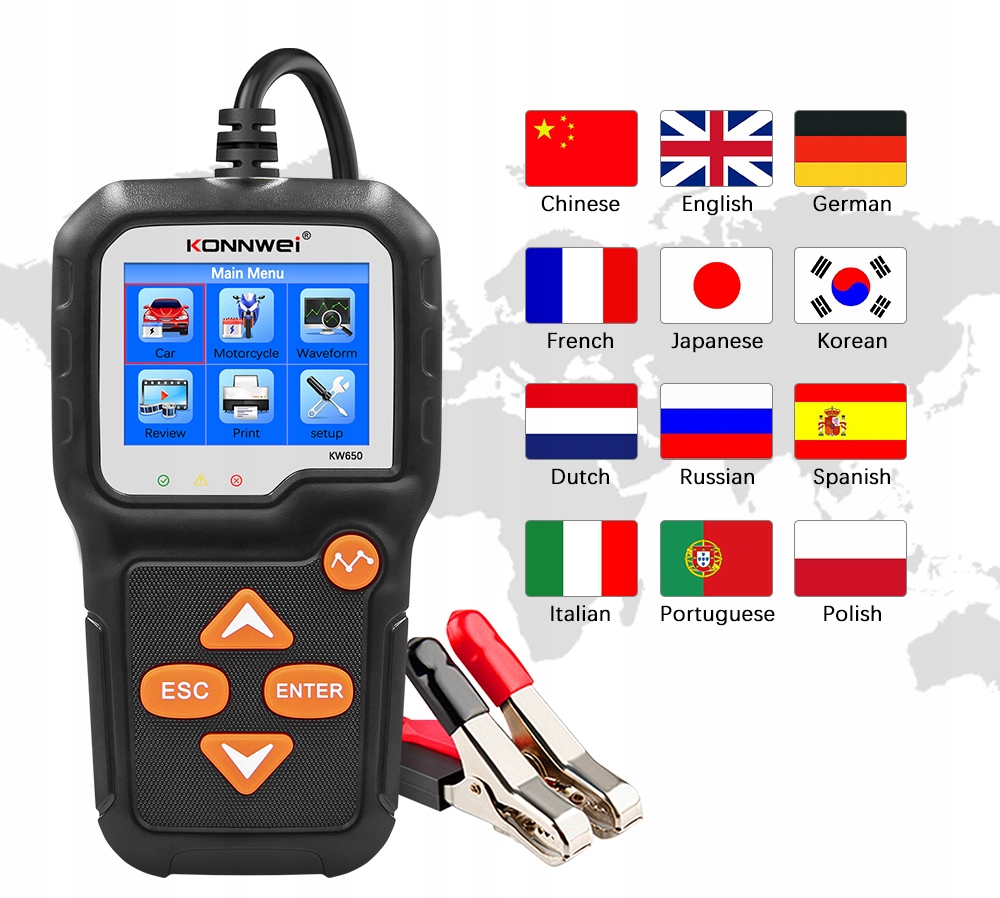 Тестер аккумуляторов KW650 поддерживает 12 языков, включая ПОЛЬСКИЙ (английский, испанский, немецкий, французский, итальянский, русский, португальский, голландский, японский, китайский, корейский).