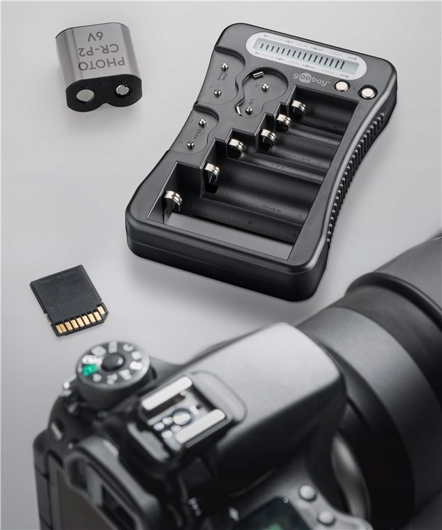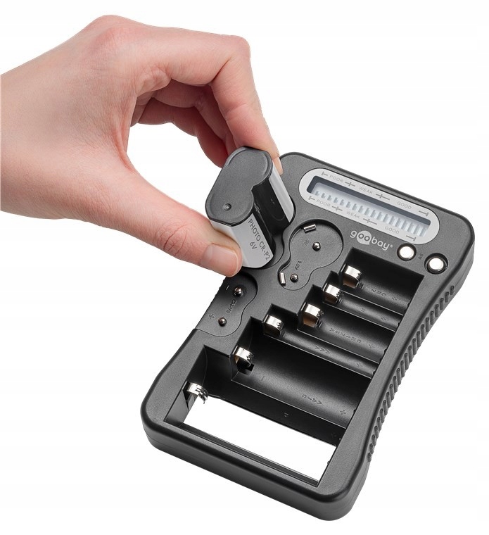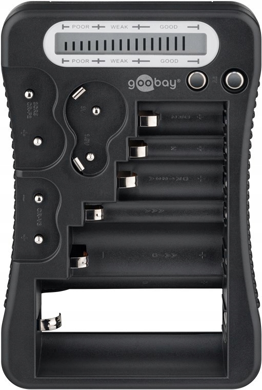 - Простой в использовании тестер аккумуляторов Goobay для проверки состояния заряда многих популярных батарей и аккумуляторов.