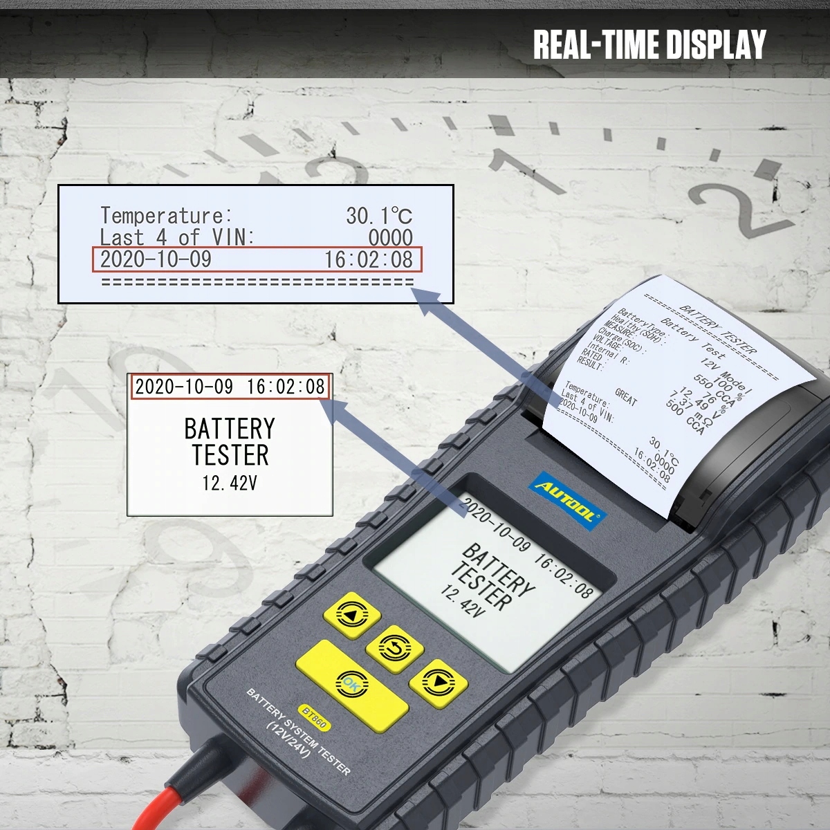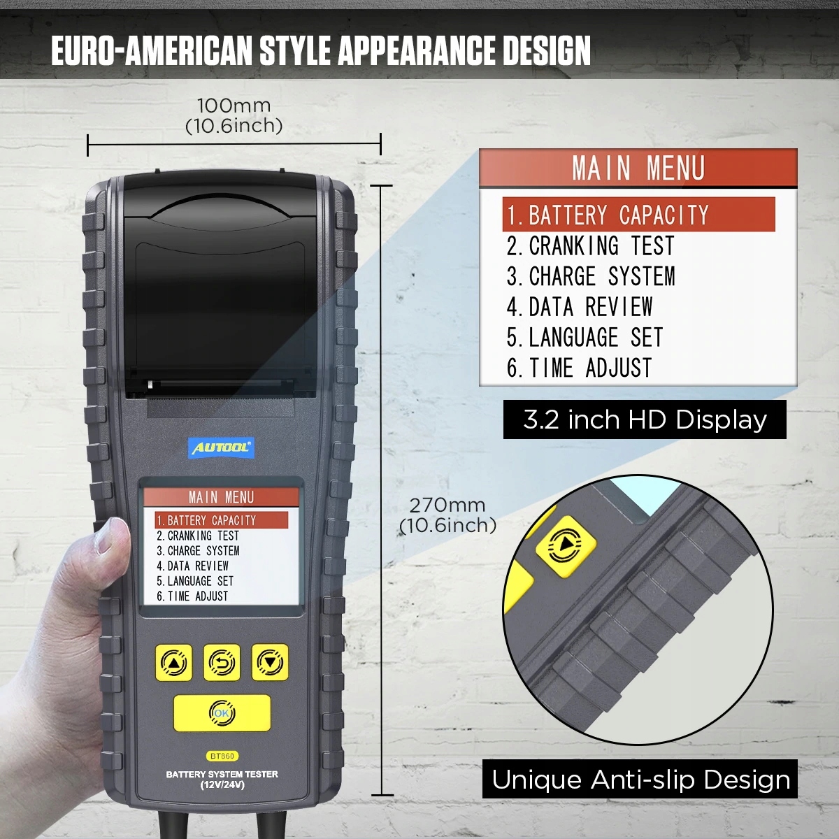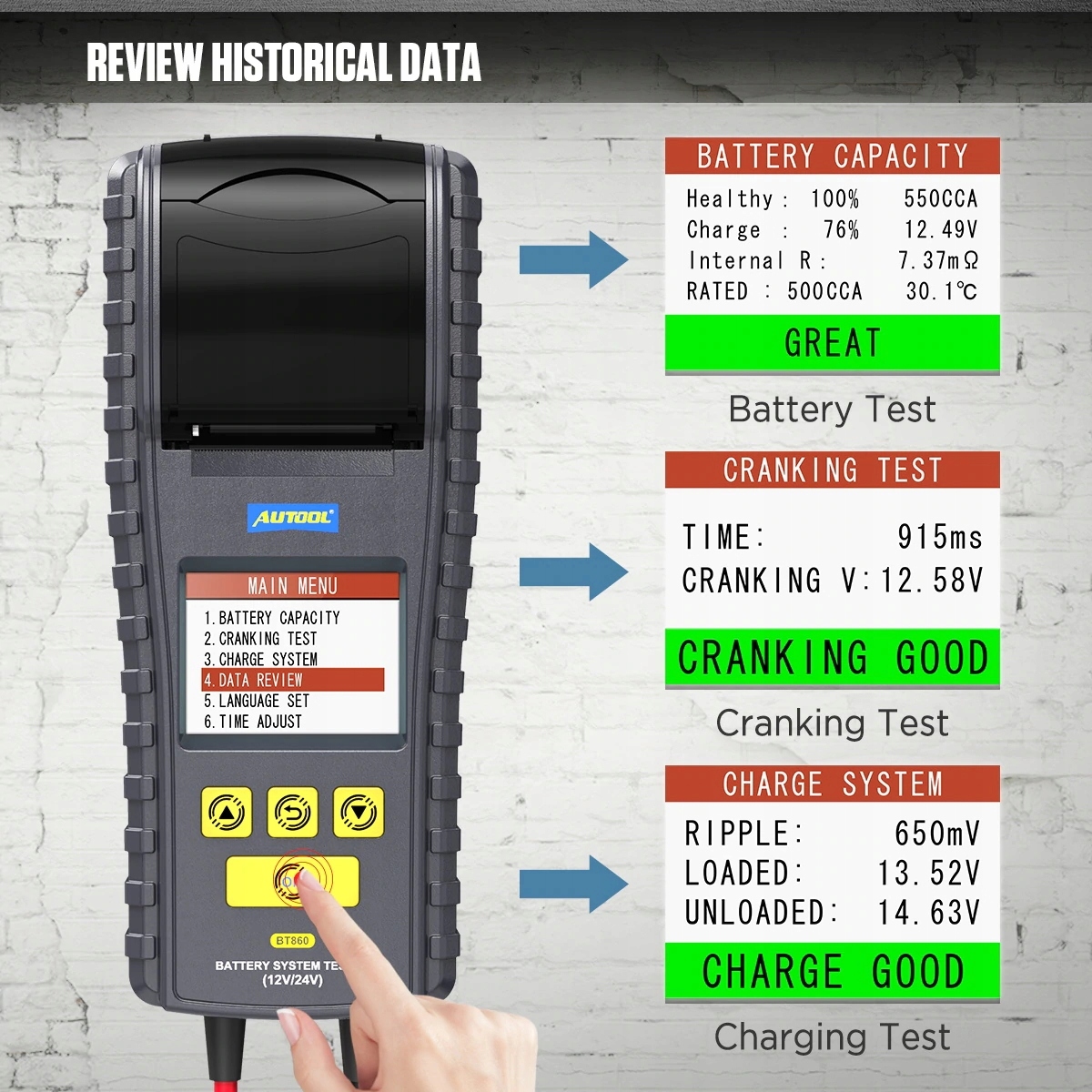 Тестер автомобильных аккумуляторов AUTOOL BT-860 со встроенным принтером.