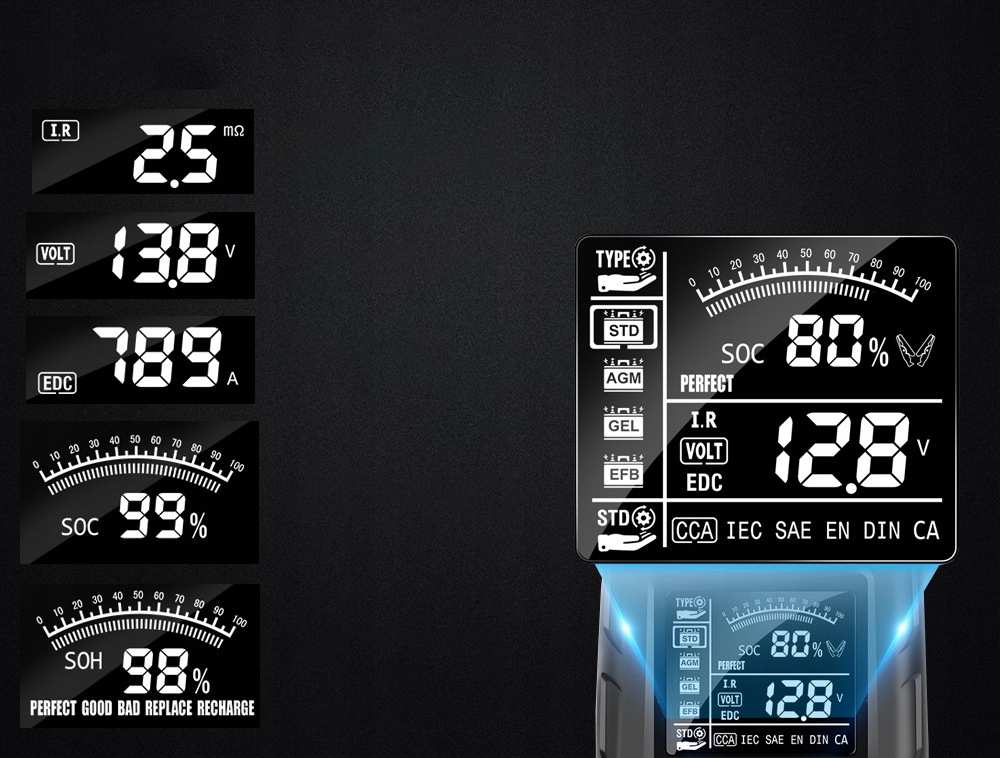 🌍 Поддержка аккумулятора всегда под рукой. С помощью нашего тестера аккумулятора с матричным ЖК-дисплеем диагностировать проблемы с аккумулятором можно где угодно! Просто держите его при себе, чтобы быть уверенным, что вы всегда будете иметь полную информацию о состоянии вашего аккумулятора. 📱