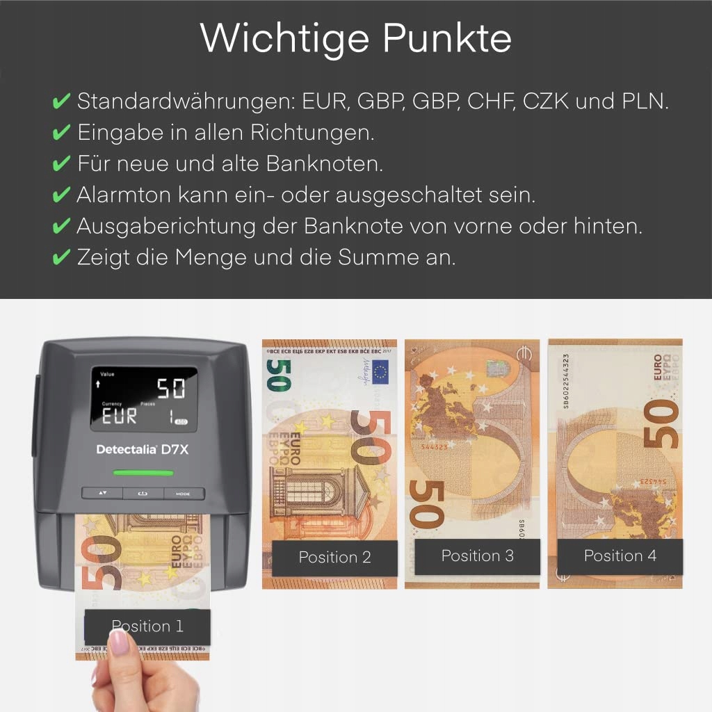 - Устройство для проверки денег в 6 валютах: евро (EUR), британский фунт (GBP), швейцарский франк (CHF), польский злотый (PLN) и шведская крона (SEK). D7X совместим с новыми и старыми банкнотами и оснащен звуковой и визуальной сигнализацией. Скорость его проверки составляет 0,5 секунды.