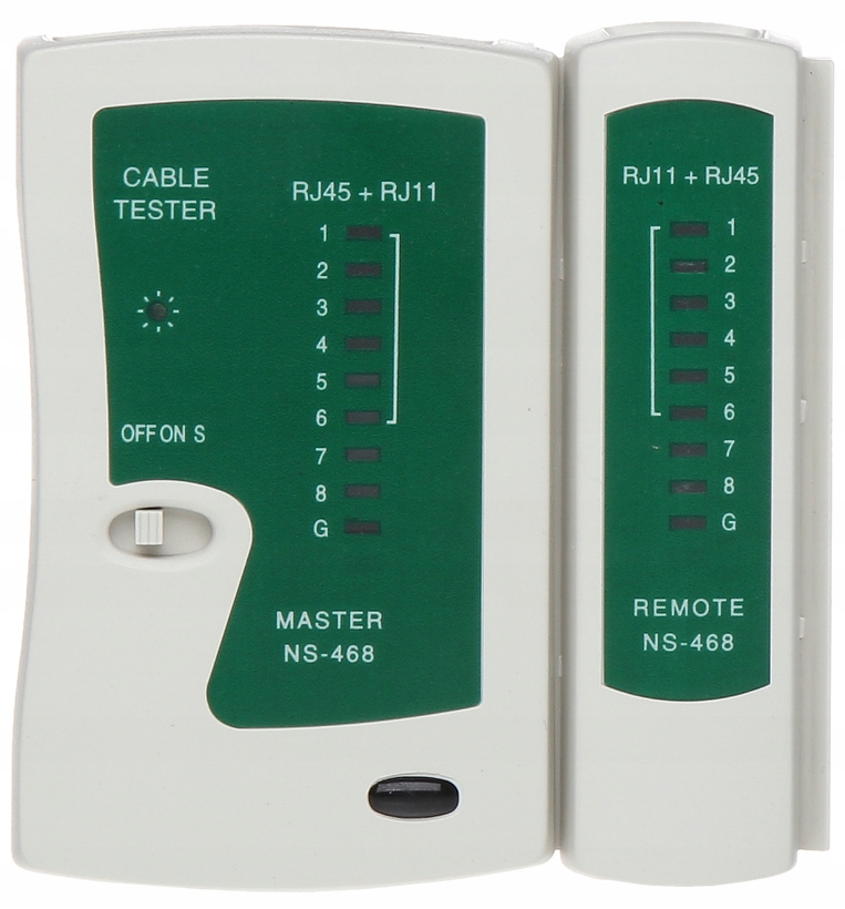 Тестер NS-468 проверяет правильность подключения кабеля и порядок расположения проводов в вилках RJ45 и RJ12. Тест можно проводить на двух скоростях. Тестер можно оставить на одной стороне кабеля, а к другому концу прикрепить пульт и производить измерения.