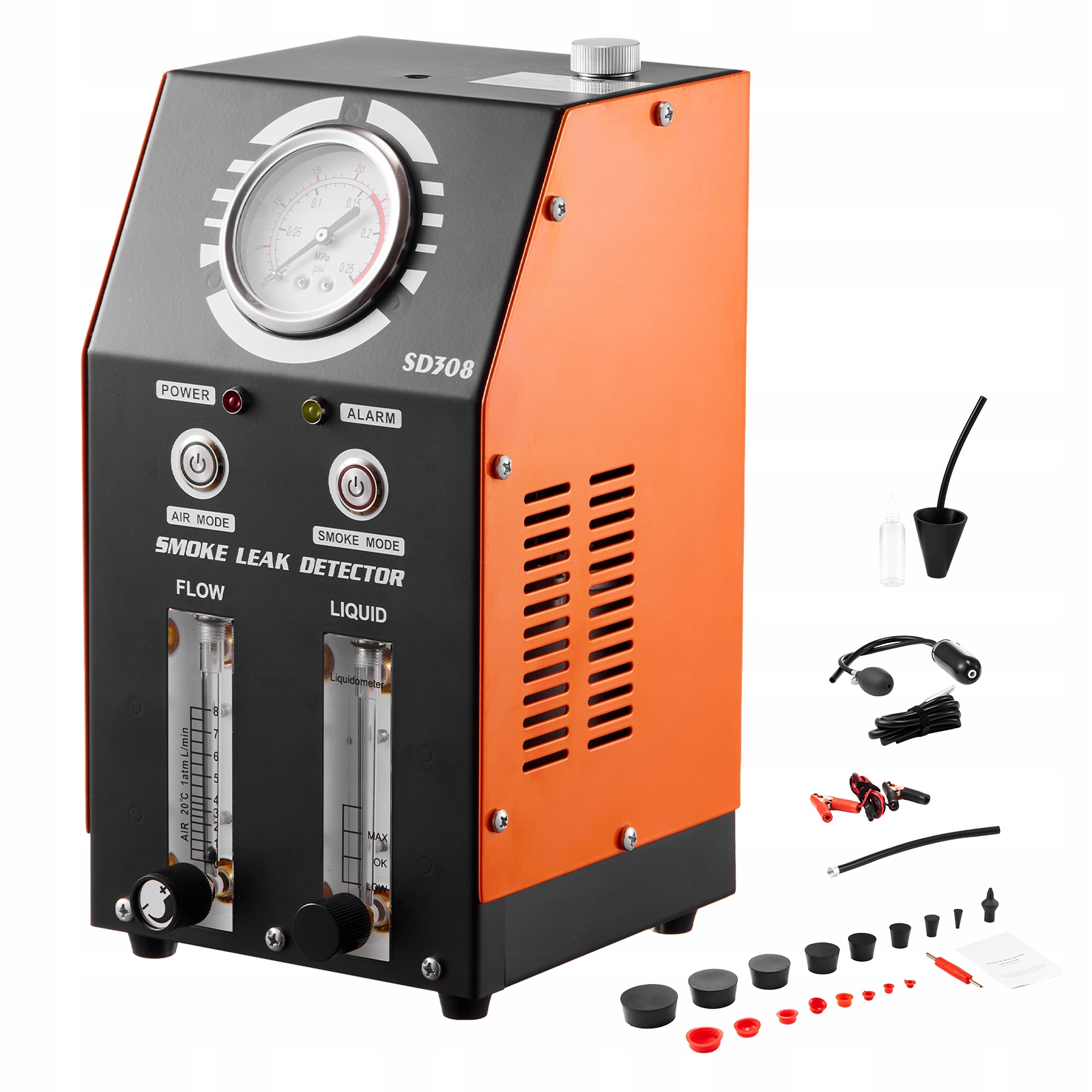 3 Точные индикаторы: этот детектор утечек топлива, оснащенный цифровым манометром, индикатором уровня масла и расходомером, предоставляет четкую информацию о состоянии для более точного обнаружения утечек. Регулятор потока позволяет легко регулировать количество дыма при различных условиях тестирования, обеспечивая оптимальные результаты диагностики.