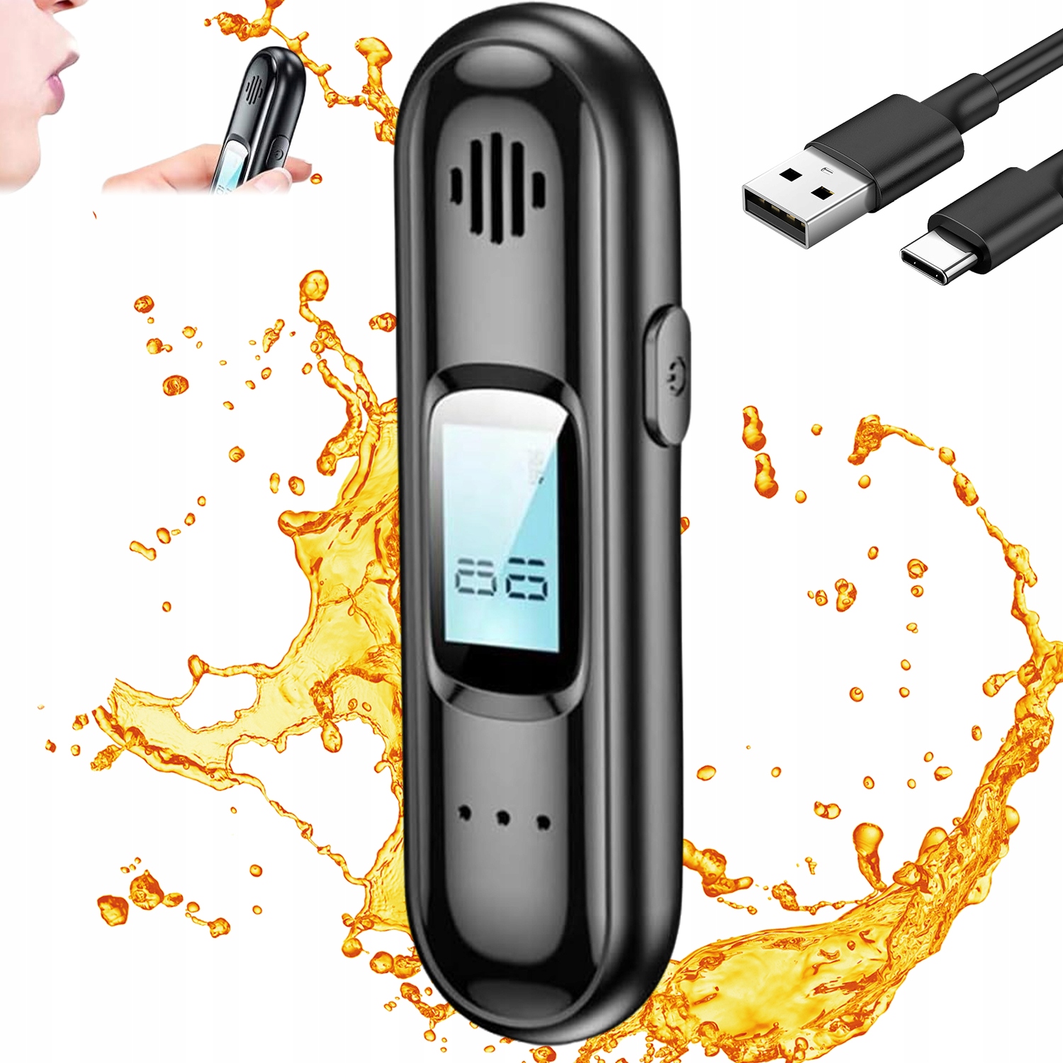 Существует 1 кнопка, нажмите и удерживайте кнопку питания, чтобы включить, подождите 10 секунд и дуть в течение 5 секунд, услышав звуковой сигнал, будет отображаться результат тестирования («Выкл» светится дважды, звуковой сигнал дважды звучит дважды, чтобы отключить). В наборе USB -кабель позволяет подключаться к USB -порту для быстрой зарядки.