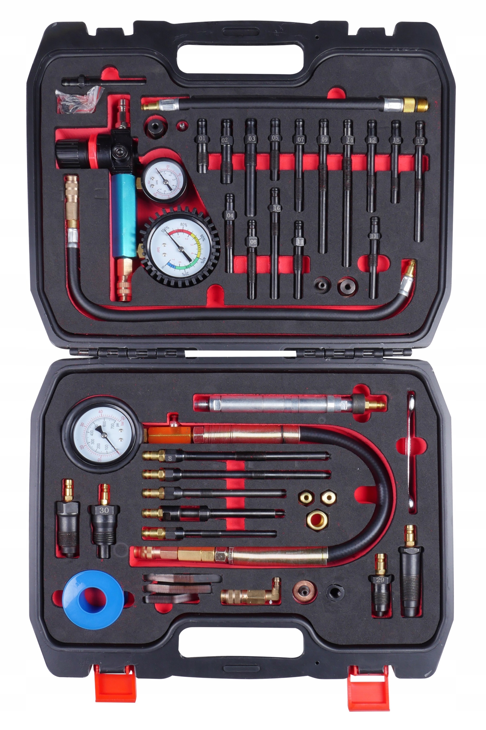 Комплект из 46 предметов для измерения компрессии и утечек в цилиндрах дизельных и бензиновых автомобилей.