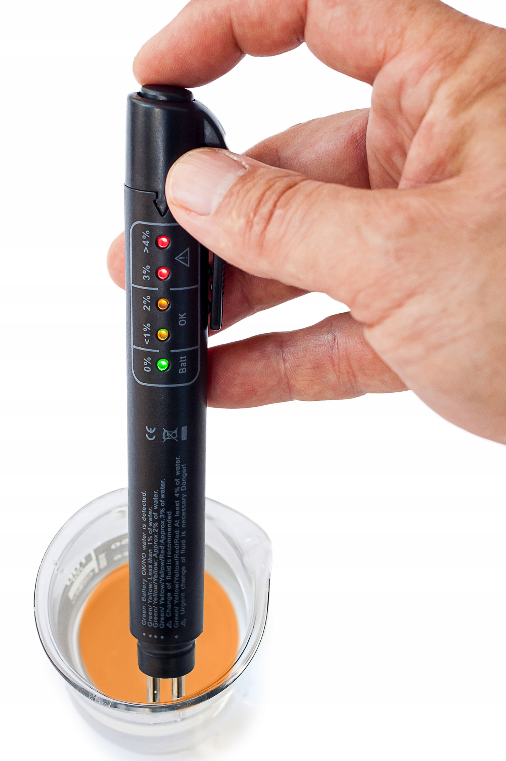 Тестер измеряет процентное содержание воды в тормозной жидкости. Тормозная жидкость не должна содержать более 2% воды.