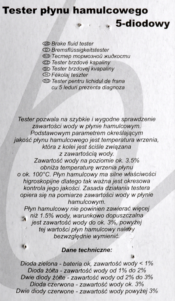 Оплачивая «ТЕСТЕР ТОРМОЗНОЙ ЖИДКОСТИ МЕТР 5 ДИОД GEKO», вы можете быть уверены, что данное изделие из каталога «Тестеры тормозной жидкости» будет доставлено из Польши и проверено на целостность. В цене товара, указанной на сайте, учтена доставка из Польши. Внимание!!! Товары для Евросоюза, согласно законодательству стран Евросоюза, могут отличаться упаковкой или наполнением.