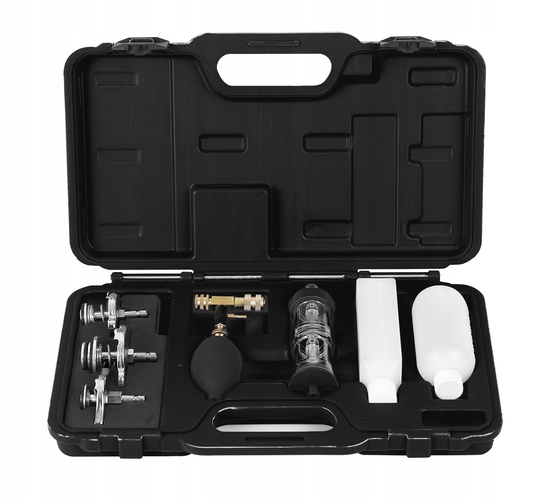 Тестер герметичности прокладок ГБЦ 11-271 от NEO Tools представляет собой комплект инструментов для измерения герметичности, состоящий из: измерительного прибора, трех переходников для различных моделей автомобилей, ручного насоса для откачки газа из системы охлаждения, пустой емкости для реакционной жидкости емкостью 250 мл, пустой емкости для отработанной жидкости объемом 180 мл и соединения с быстроразъемным соединением. Тестер NEO Tools позволяет легко диагностировать и быстро обнаруживать повреждения прокладки головки блока цилиндров. Рекомендуется механикам и любителям автомобилестроения. Реакционная жидкость в комплект не входит.