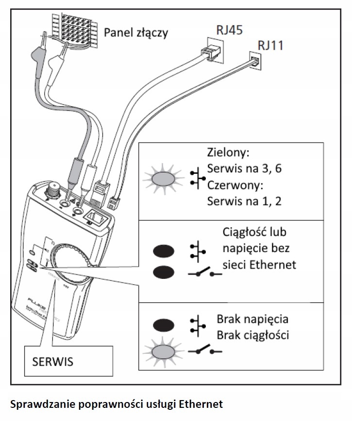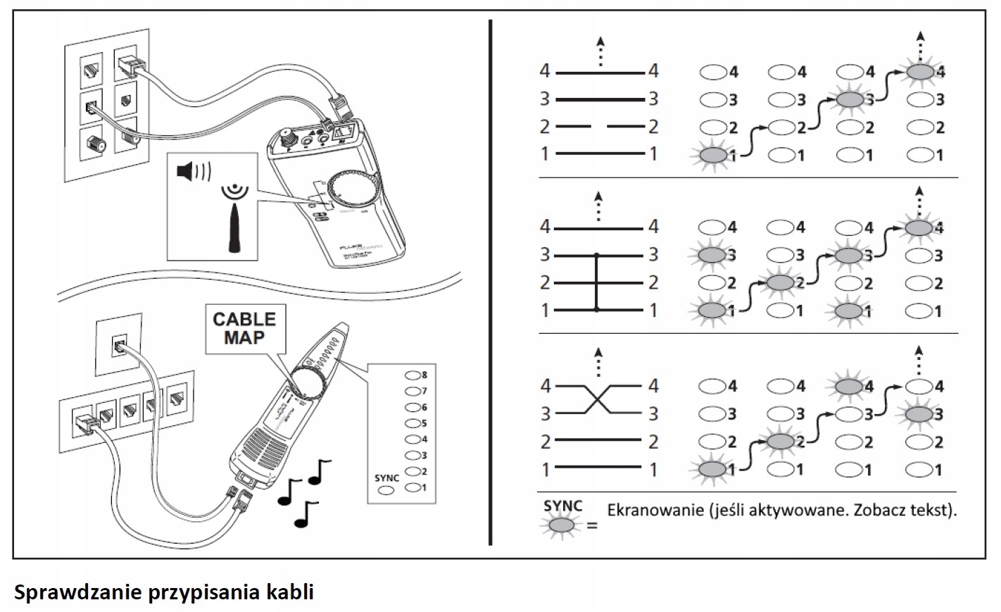 - Проверяет поток и целостность, шаг за шагом распознает ошибки (обрывы, замыкания и перепутанные пары).