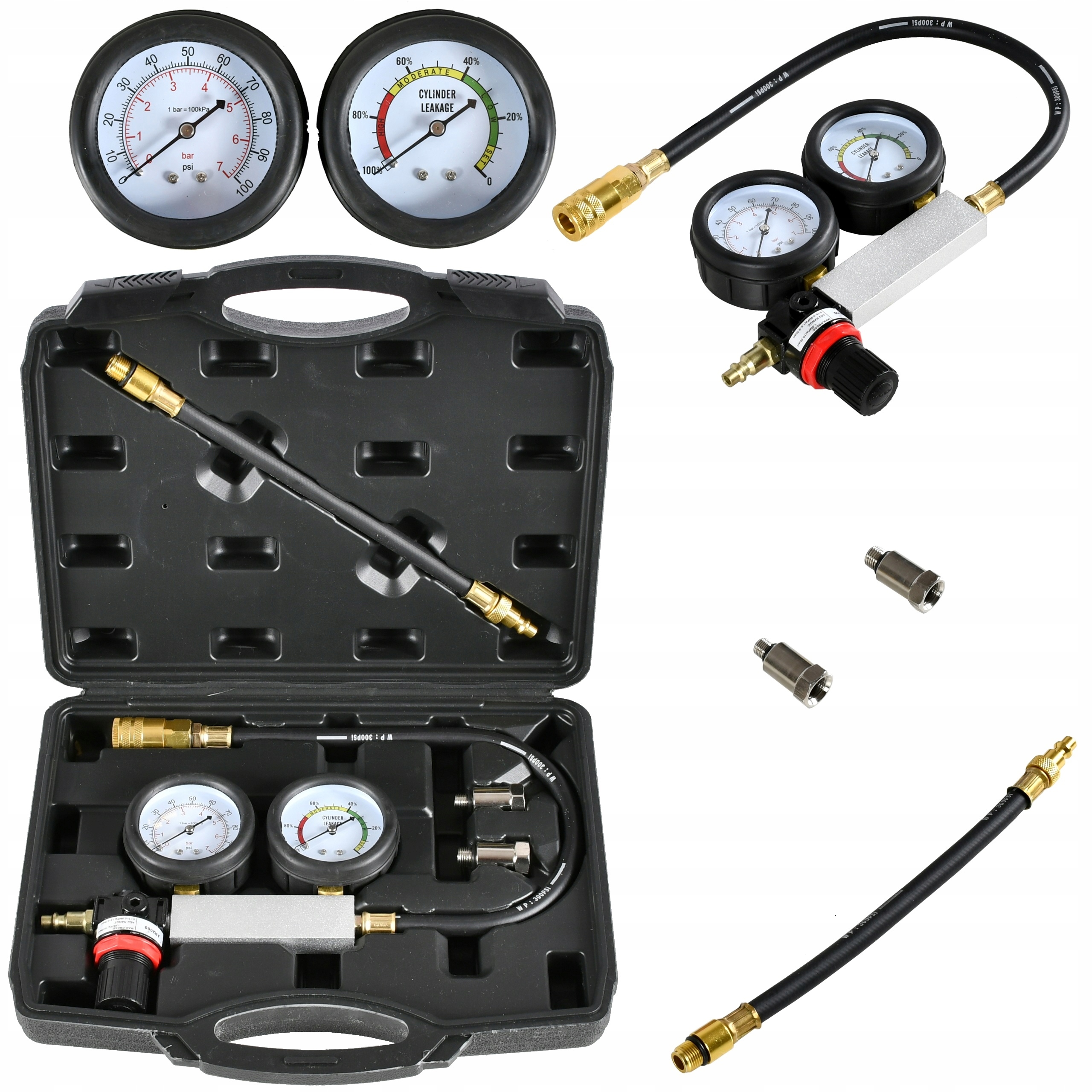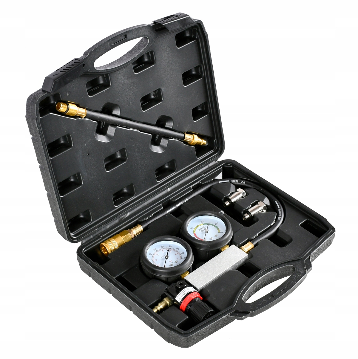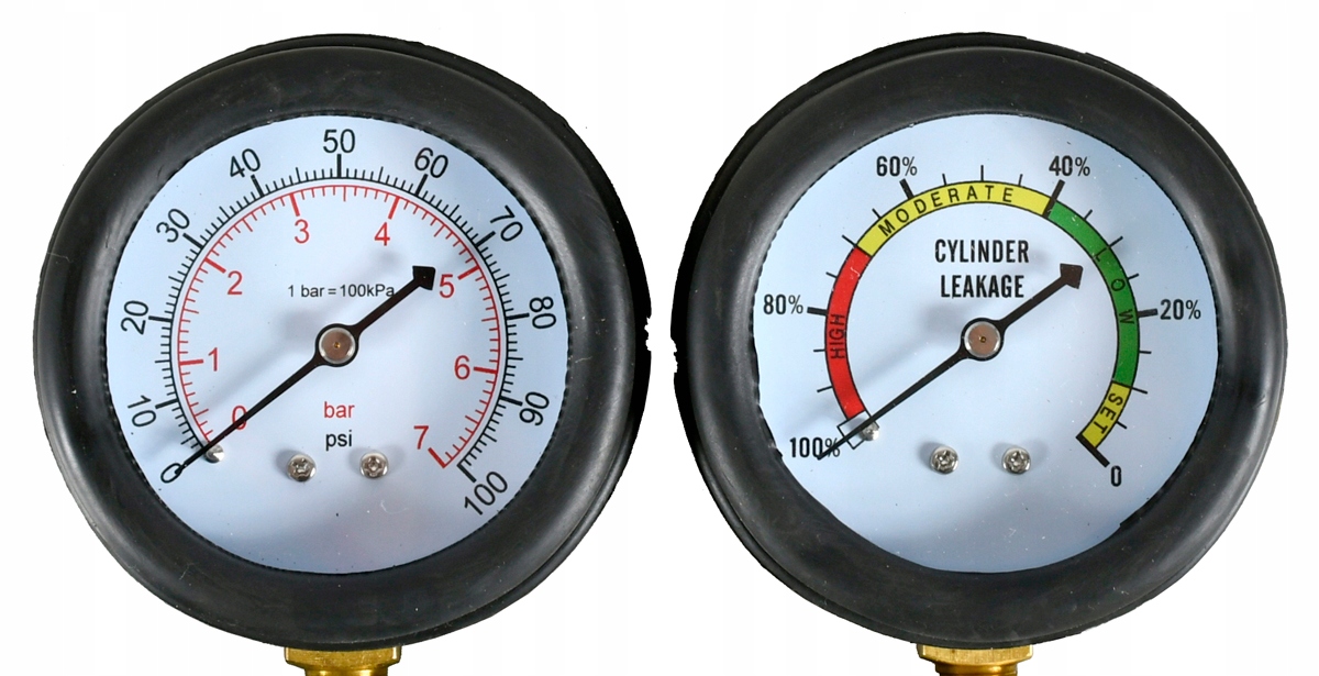 Прибор для измерения компрессии используется для обнаружения утечек в цилиндрах двигателя. Он оснащен двумя детекторами для измерения давления и для измерения потери давления в процентах. В зависимости от места измерения также можно диагностировать место утечки.