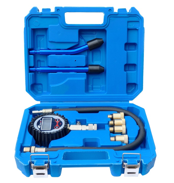 Тестер для измерения давления сжатия в двигателях с искровым зажиганием автомобилей и мотоциклов с бензиновым двигателем. Манометр с четким ЖК-дисплеем показывает измеренное значение (в единицах: фунты на квадратный дюйм, кПа, бар, кгс/см²) и состояние заряда аккумулятора.