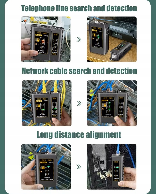 Это многофункциональный тестер сетевого кабеля для проверки состояния переключения/оф -линии, тестирование сетевых кабелей и тестирование на большие расстояния . Съемная деленная часть тестера и регулируемая скорость позволяет более удобно использовать сигнальные диоды