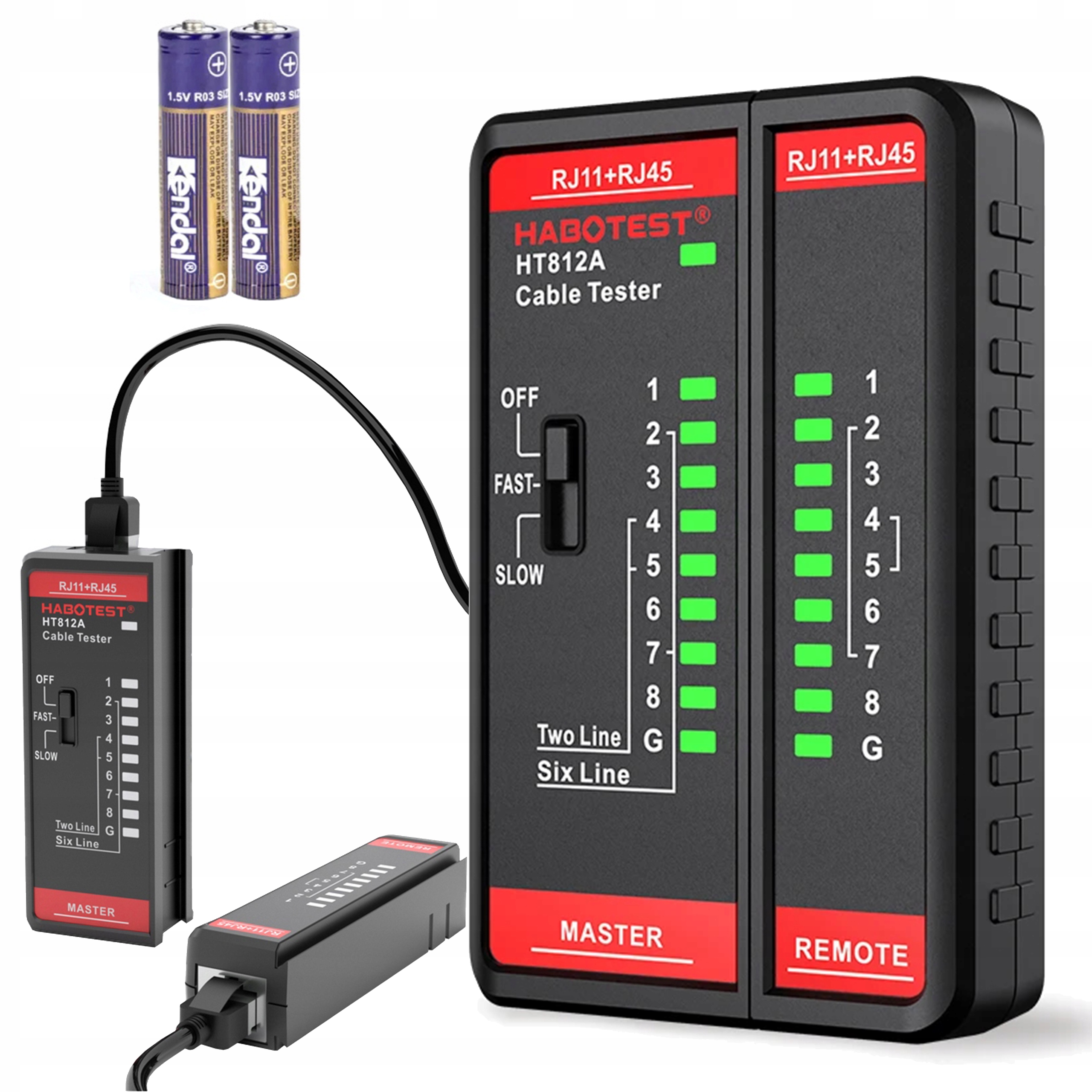 С помощью кабельного тестера Habotest можно успешно получить информацию о работе кабелей с RJ11 i b> RJ45. Вы можете легко проверить полезность телефонных и сетевых кабелей. Устройство отличается компактной складной конструкцией. Питается от 2 батареек типа ААА.