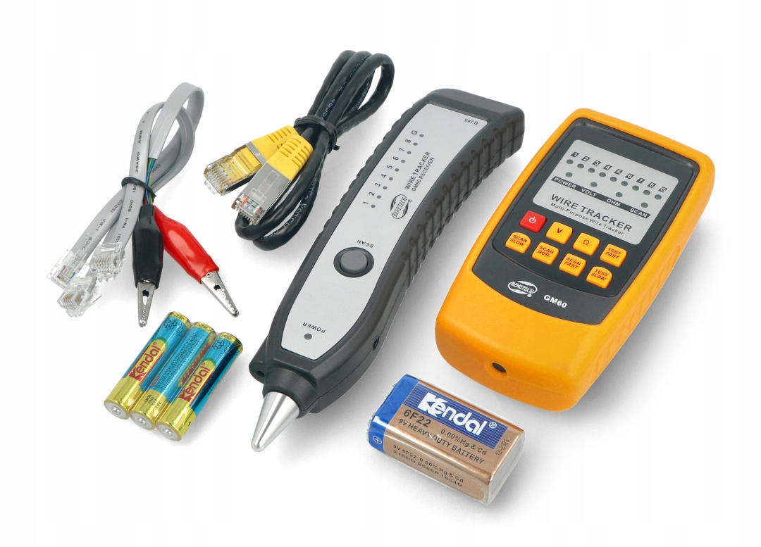 Benetech GM-60 RJ-11 и RJ-45, который позволяет широкому диапазону тестирования различных типов кабеля. Устройство питается батареей типа 6F22 для приемника и тремя батареями 1,5 В для передатчика, что обеспечивает длительную работу без необходимости частой замены питания.