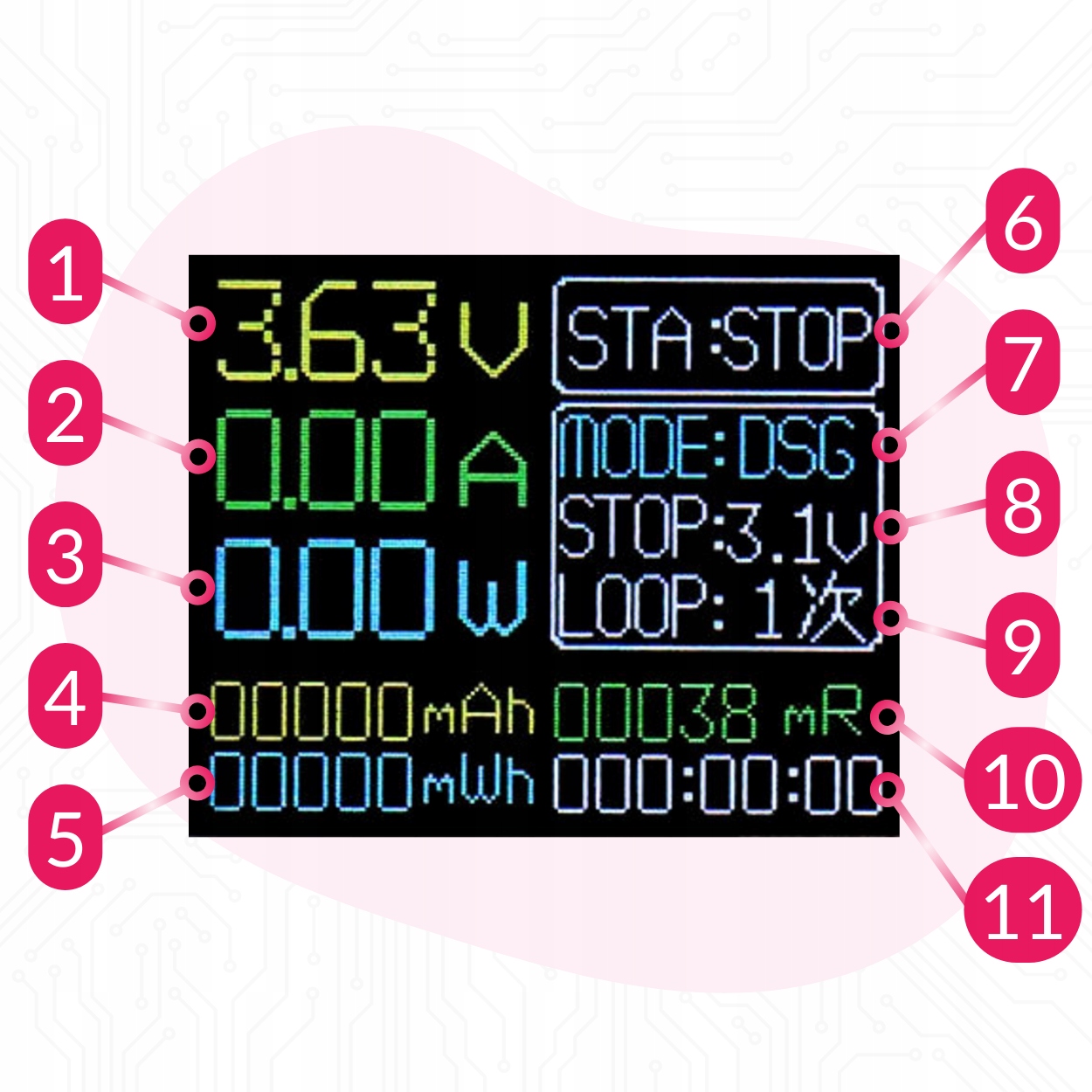 ☝️Емкость измеряется только во время разрядки. При использовании функции зарядки необходимо подключить зарядное устройство USB.