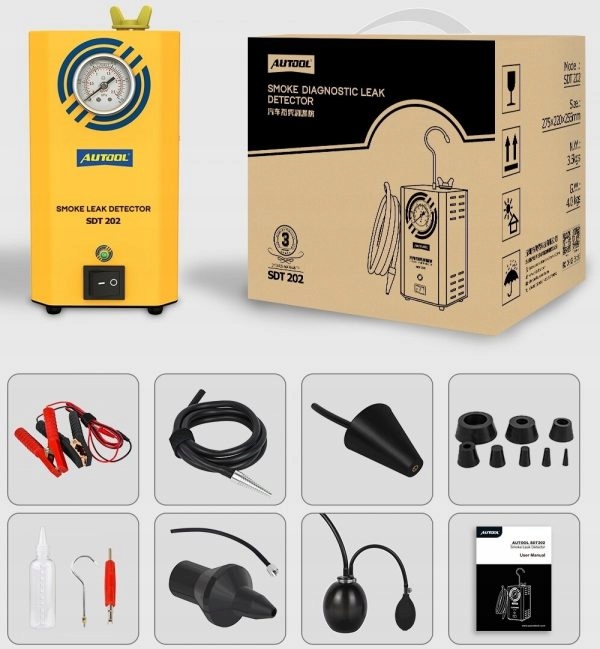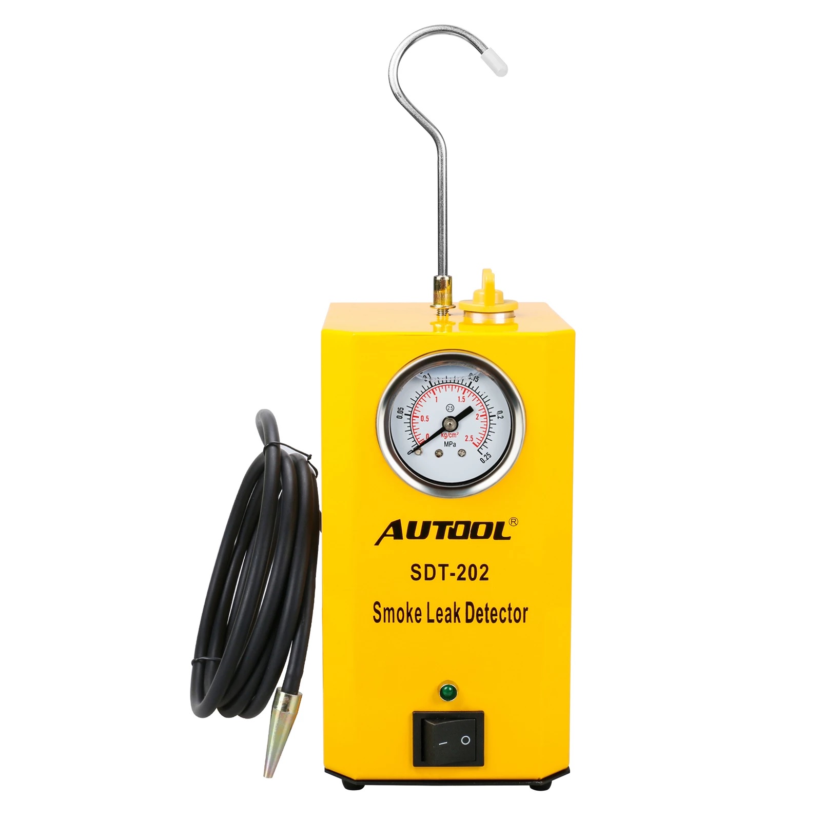 Autool SDT202 выделяет дым, который попадает в герметичную трубопроводную систему автомобиля. Например, воздухозаборники, выхлопные системы, топливные системы, кондиционеры и т. д.