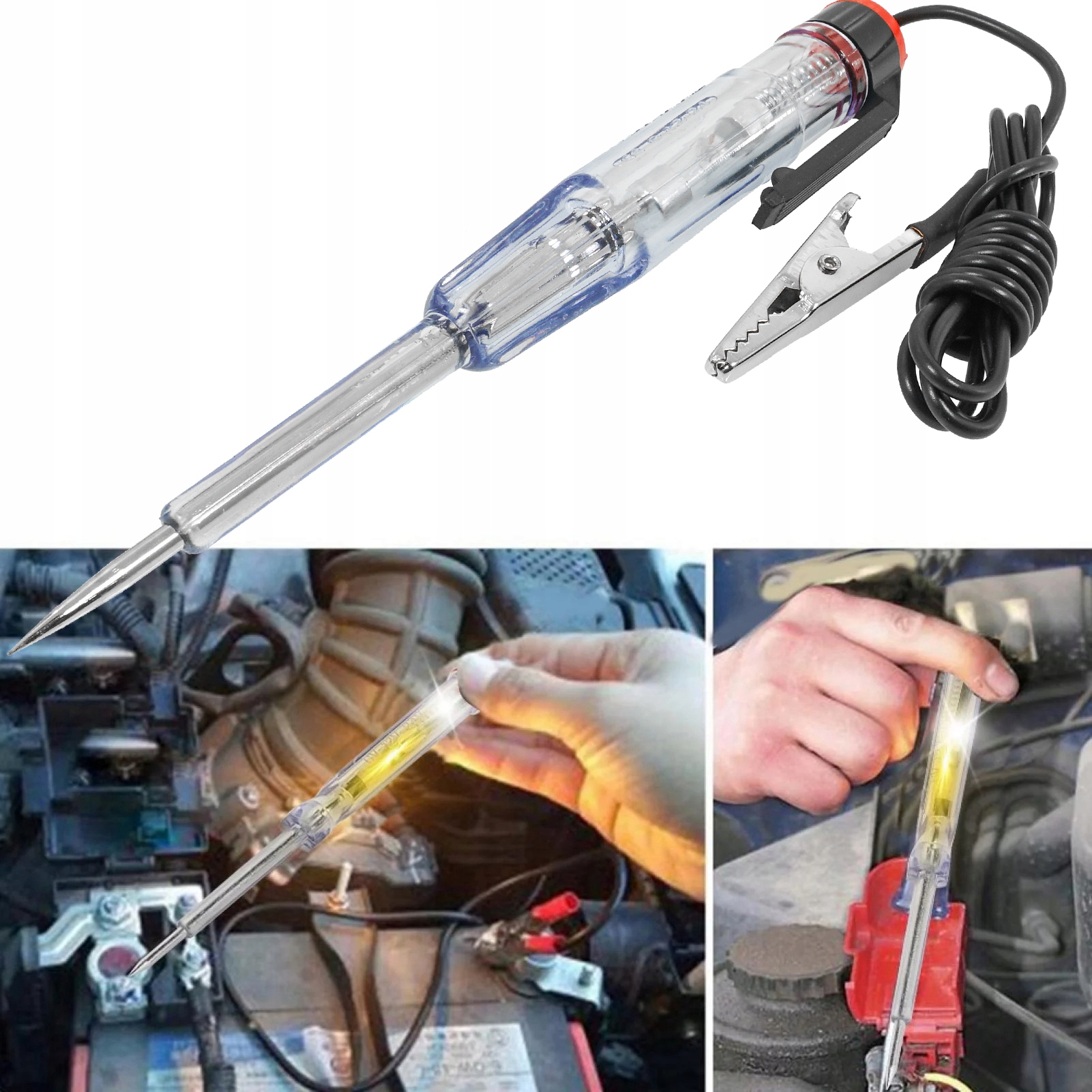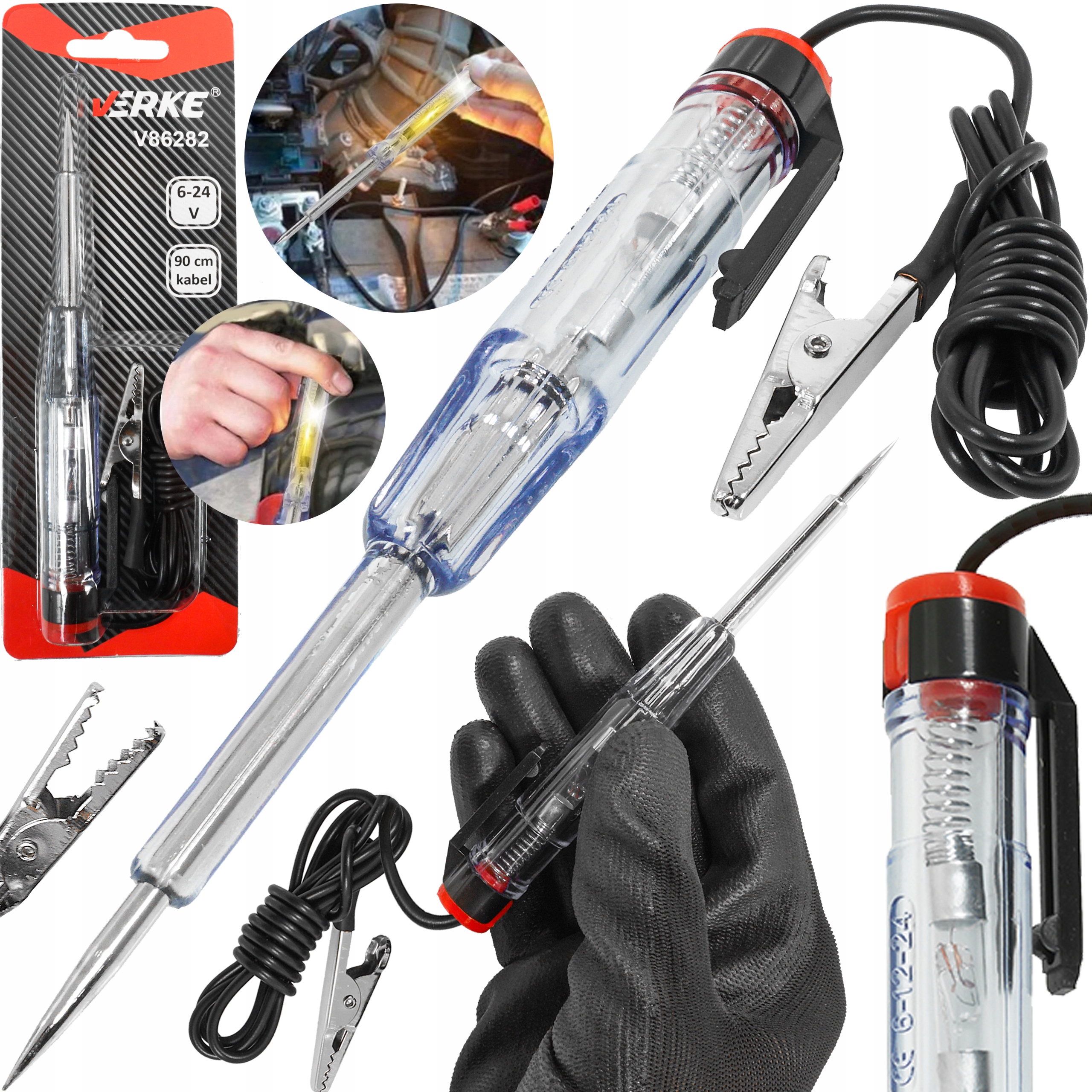 Автомобильный тестер напряжения, оснащенный светодиодом. Диапазон измерения от 6 В до 24 В. Длина кабеля 90 см.