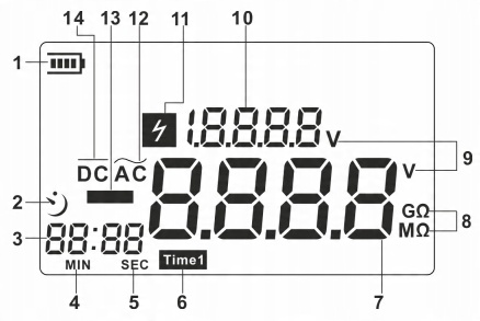Индикаторы перегрузки: Индикаторы перегрузки: OL появляется, когда диапазон изоляции перегружен, и LO появляется, когда диапазон напряжения превышен.