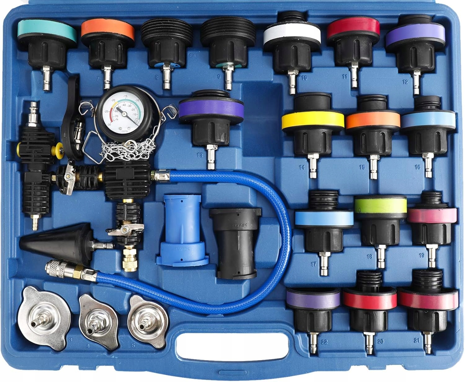 Тестер системы охлаждения компании является идеальным набором для давления системы охлаждения и герметичных крышек. Наш продукт позволяет быстро найти утечки системы охлаждения, например, Уплотнения головки цилиндров, радиаторы, водяные насосы, змеи и т. Д.