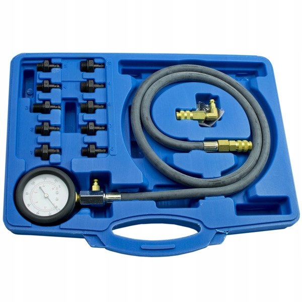 Профессиональный прибор для измерения давления масла в двигателях внутреннего сгорания. Комплект оснащен быстроразъемными разъемами. Подходит для легковых автомобилей, грузовых фургонов и некоторых грузовых автомобилей MAN, DAF, RENAULT, SCANIA, VOLVO.