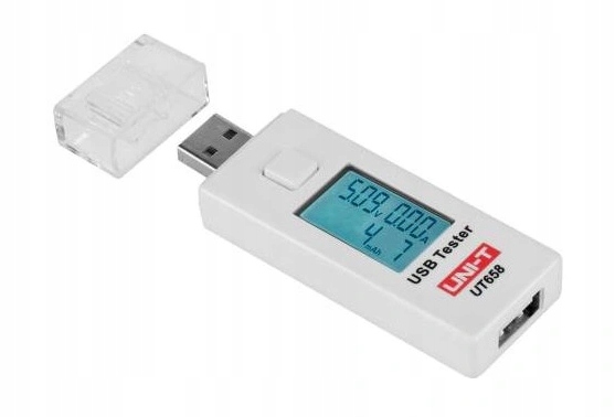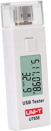 Универсальный USB-измеритель UNI-T UT658 UT-658 в форме флешки. Работает по принципу plug and play, не требует батареек. Он позволяет измерять потребляемый ток и напряжение на разъеме. Измеритель имеет штекерный вход и выход: разъем USB 2.0.