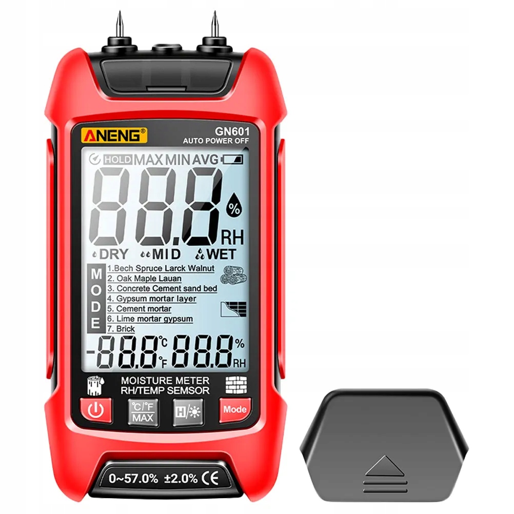 Освещенный экран с четко видимым чтением большого шрифта, идеально подходит для темной среды, хранения данных для поддержания текущих измерений. С сухой и средней влажностью, отображая красный экран с влажной влажностью.