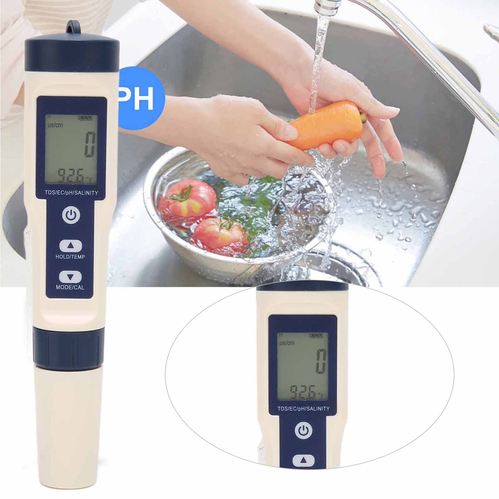1. Это многофункциональный тестер качества воды, который может измерять pH, TDS, EC, соленость и температуру воды.