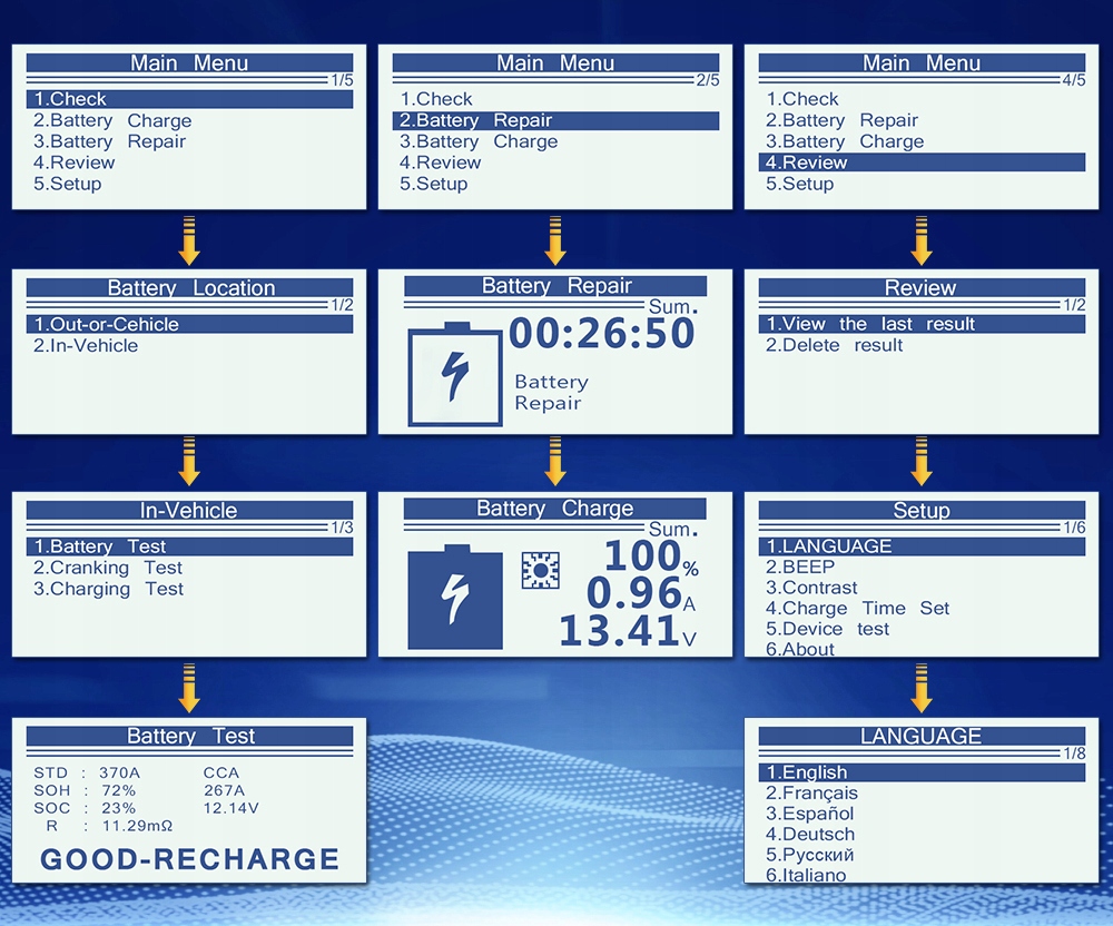 KW520 не только проводит диагностику, но и выполняет функцию зарядного устройства. Он способен заряжать различные типы свинцово-кислотных автомобильных стартерных аккумуляторов напряжением 12 В и емкостью от 4 Ач до 150 Ач. Поддерживает стандартные свинцово-кислотные батареи, плоские батареи AGM, спиральные батареи AGM, гелевые батареи, а также литий-железо-фосфатные батареи (LiFeP04).