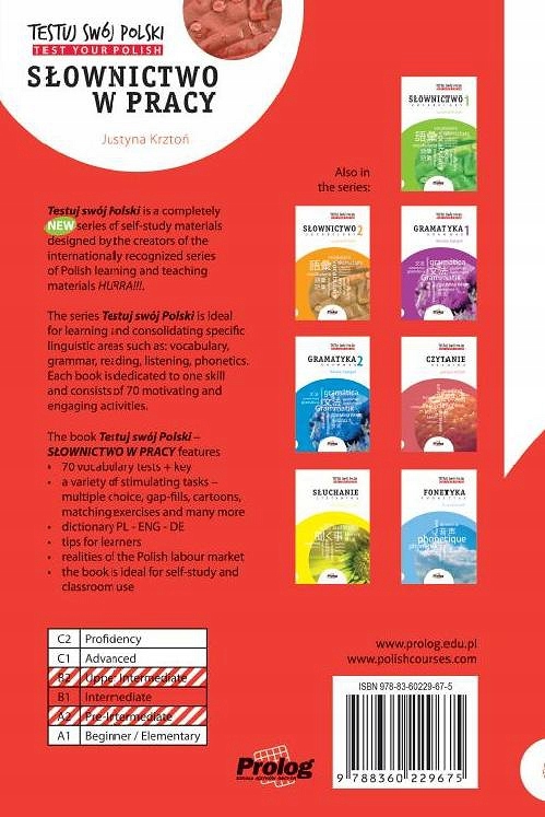 "ПРОВЕРЬТЕ СВОЙ ПОЛЬСКИЙ - СЛОВАРЬ НА РАБОТЕ" — это сборник упражнений уровней А2-В1, который можно использовать для самостоятельного обучения и в качестве вспомогательного материала для групповых занятий. Книга предназначена для взрослых, которым польский язык необходим для общения на рабочем месте, в Польше и за рубежом. Упражнения содержат много реальной информации о польском рынке труда. Практические советы, содержащиеся в книге, могут быть полезны иностранцам, которые ищут работу в Польше, хотят открыть компанию и связаться с офисами, коллегами, деловыми партнерами и т. д. на польском языке.