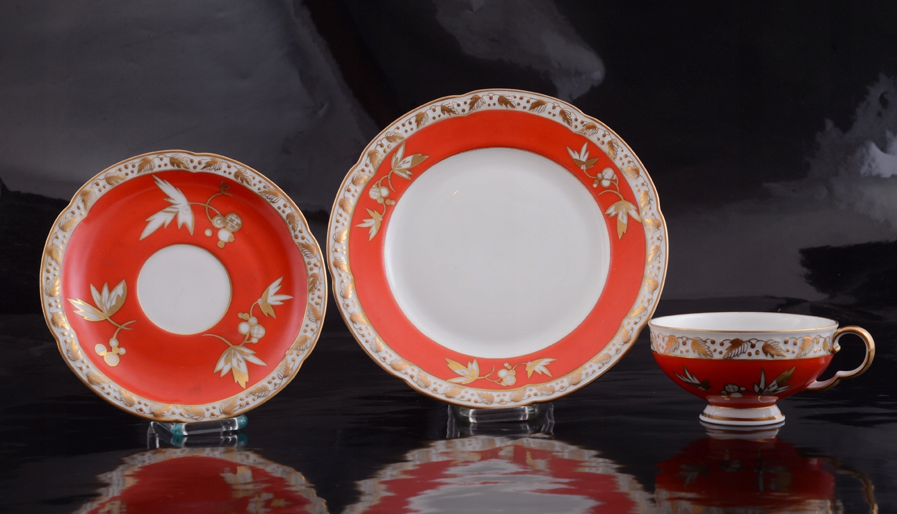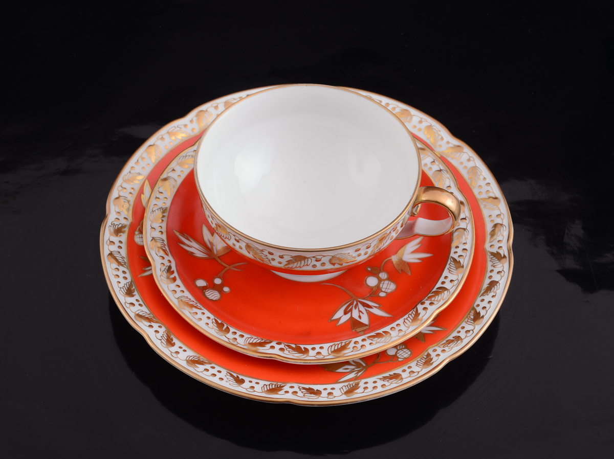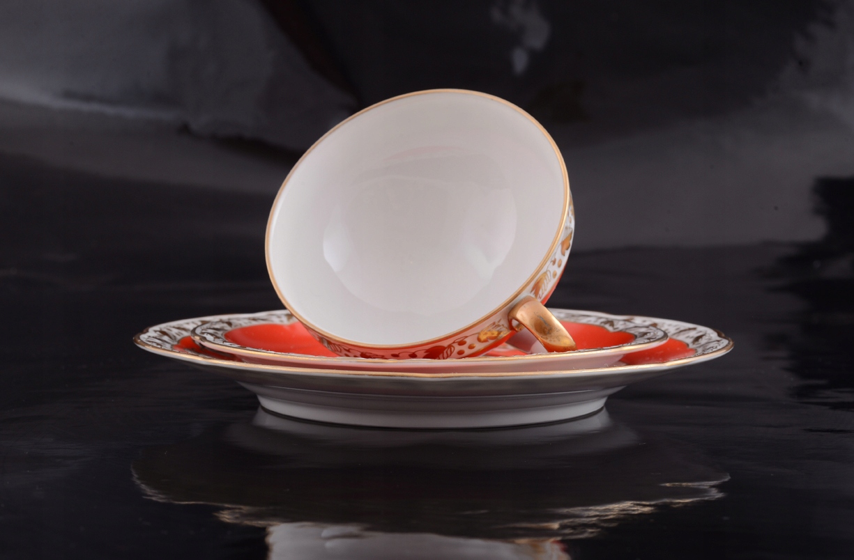 Предлагаемый нами набор для завтрака состоит из чашки, блюдца и тарелки. Родом из 1930-х годов, он подкупает чудесным, ярким красным цветом и украшениями - позолоченными цветочными мотивами, с рельефом (фарфор расписан вручную).