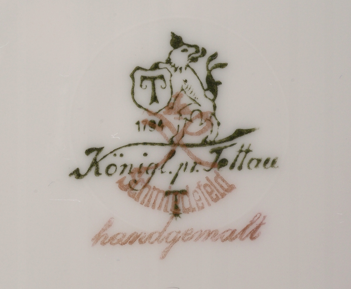 На дне позолоченный знак компании Tettau. и дополнительный - покрасочного цеха: Schmiedefeld (от с припиской "handgemalt" - ручная роспись).