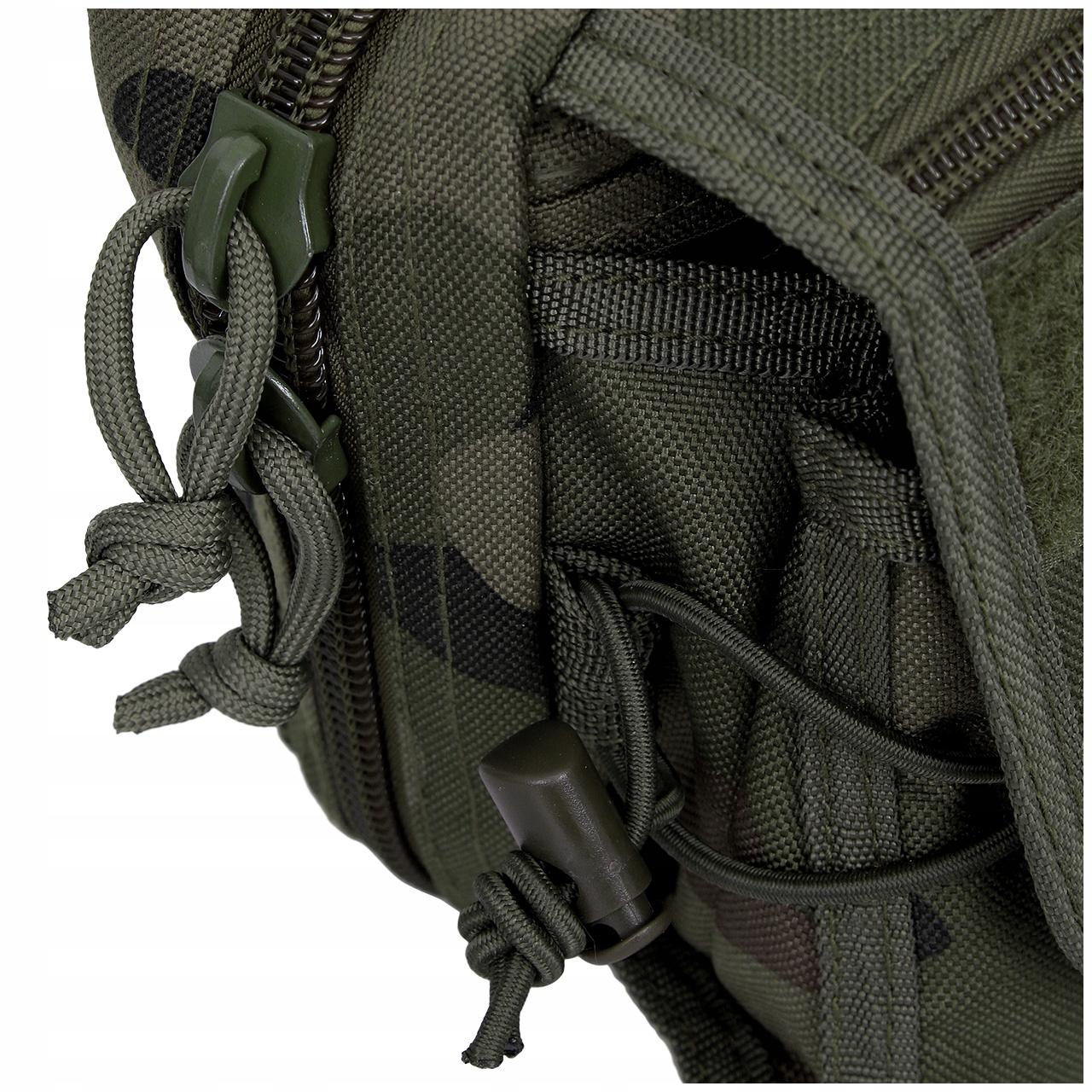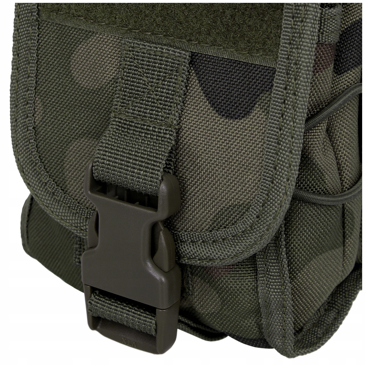 Крепление выполнено из лямок системы MOLLE/PALS, что делает подсумок совместимым практически с любым современным тактическим снаряжением – его можно прикрепить к ремень, тактический жилет или рюкзак. Крепежные ремни усилены, что облегчает их продевание. Черненые металлические защелки гарантируют надежное крепление.