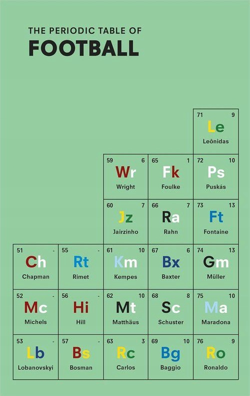 Никогда нельзя относиться к тому, что любишь, слишком серьезно, и «Периодическая таблица футбола» отмечает этот факт. Добро пожаловать в Периодическую таблицу футбола. Вместо водорода в гелий здесь вы найдете Пеле и Зеппа Блаттера - 108 элементов футбольного пантеона, упорядоченных по их свойствам и поведению на поле и за его пределами. Это экспертное руководство охватывает более 150 лет и предлагает оригинальный взгляд на прекрасную игру.