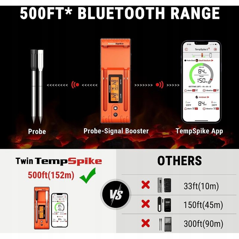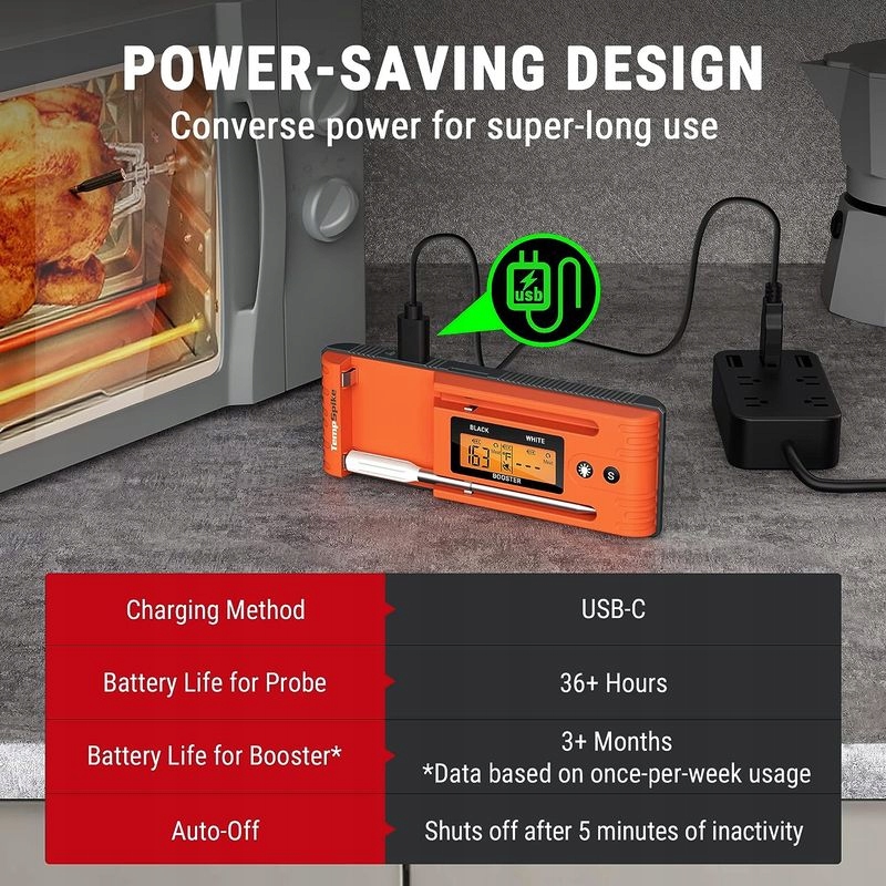 <ул>Беспроводной кухонный термометр, дизайн Meater, 2 зонда, подключение Bluetooth 5.2, радиус действия до 150 метров, подключение к приложению, два датчика температура, IP 67