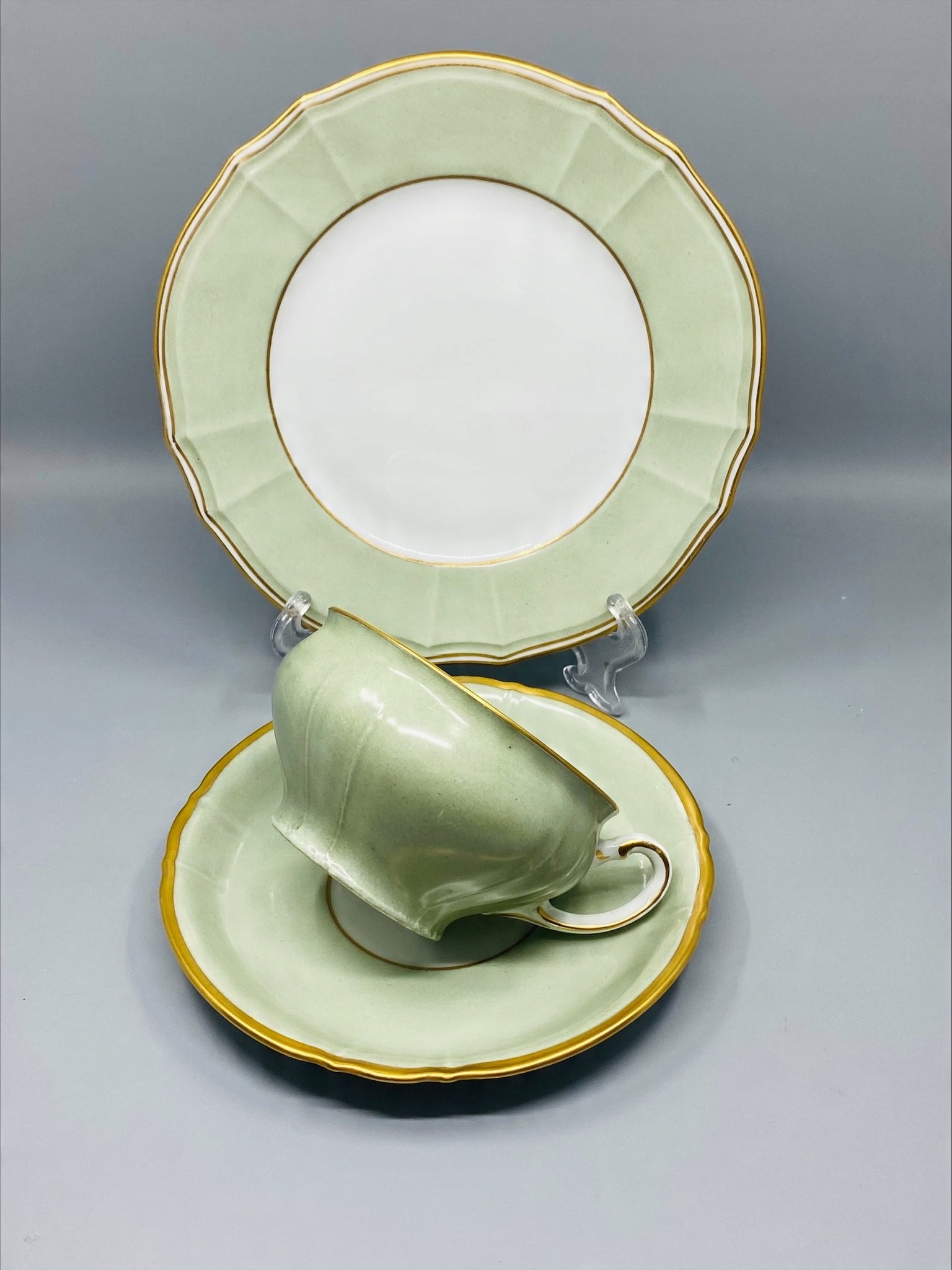 Белый фарфор, декорированный в изысканном мятном цвете. Широко позолоченные края. Чашка в стиле Бидермейер бочкообразной формы. Декоративная ручка.
