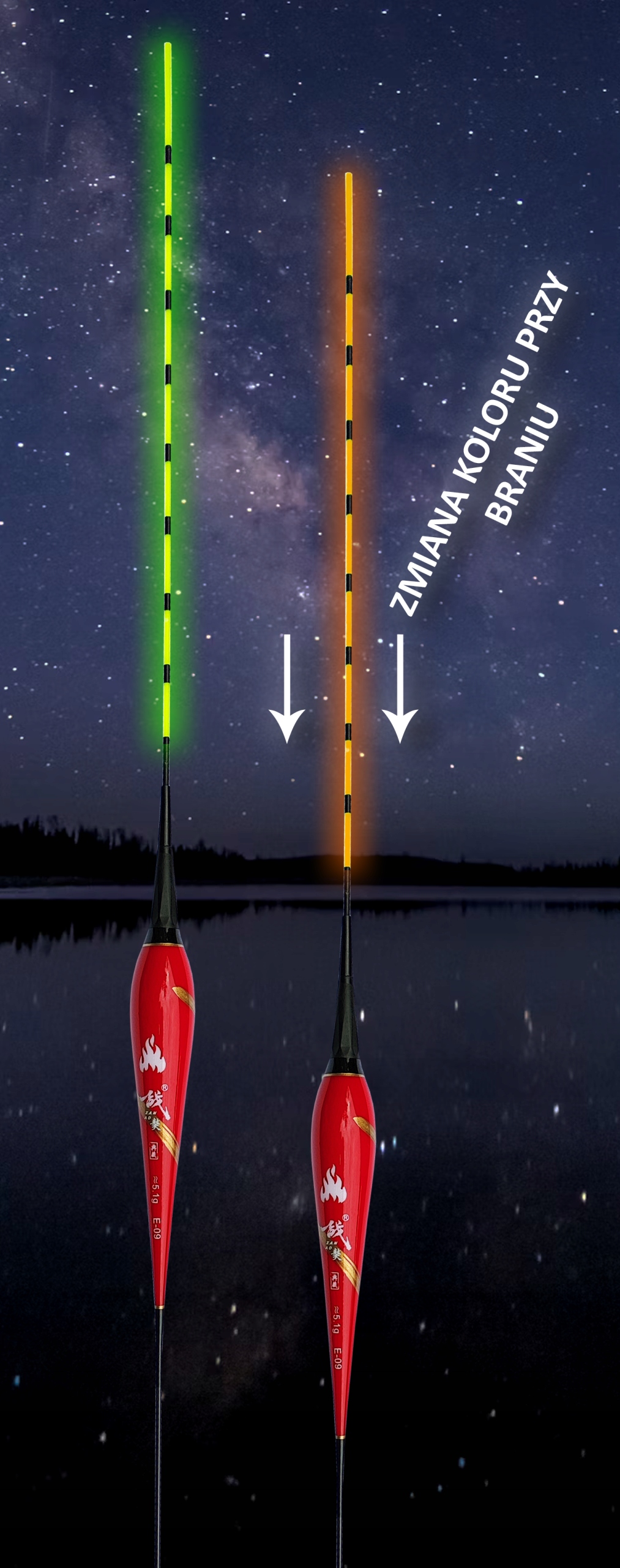 Поплавок со специальным гравитационным модулем – сигнализирует о поклевке изменением цвета антенны с желтого на оранжевый. Более того, его можно использовать по-разному: полностью без подсветки, запускать в режиме светодиодного фонаря без индикации поклевки или запускать в режиме фонаря с индикацией поклевки. Поплавок реагирует на более быстрое движение вверх/вниз, но не сигнализирует о естественном движении поплавка в воде.