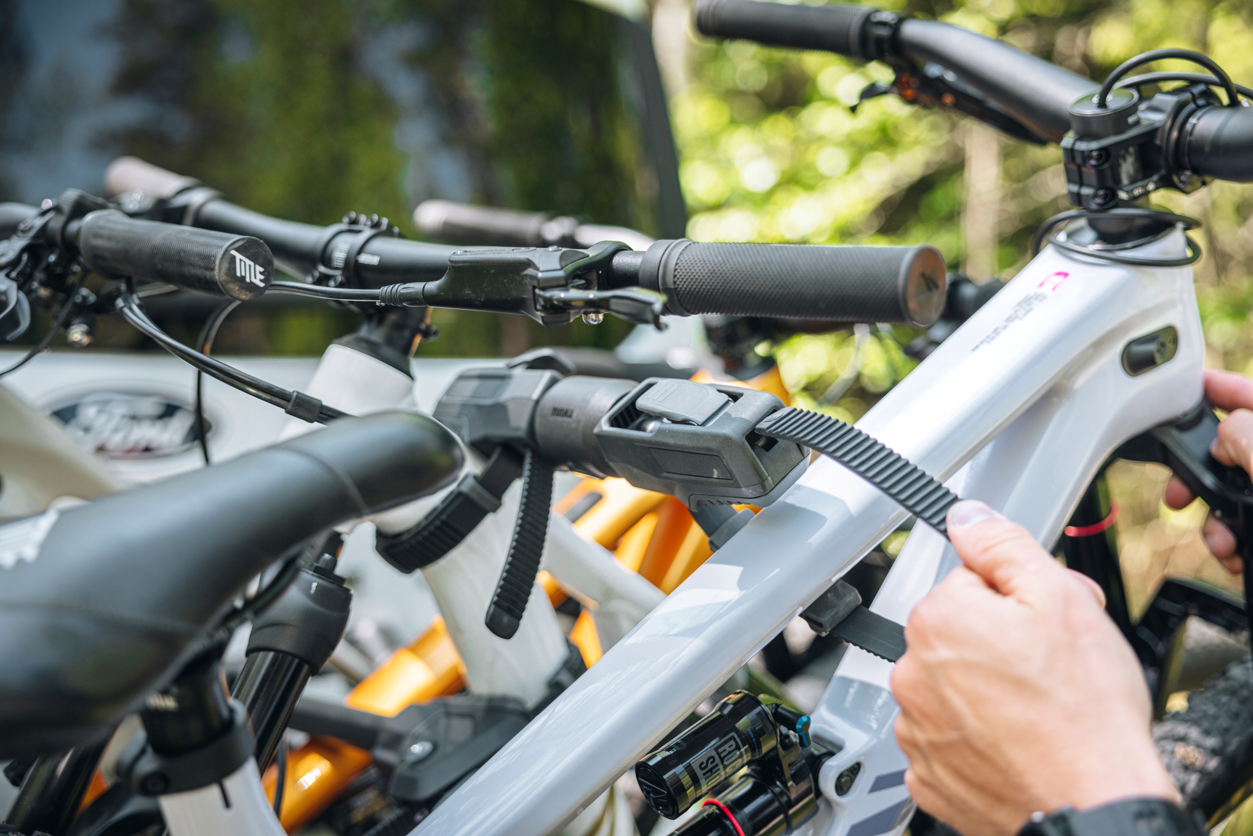 Рычаг велосипеда имеет запирающиеся ремни и совместим с системой Thule One-Key (замок в комплекте)