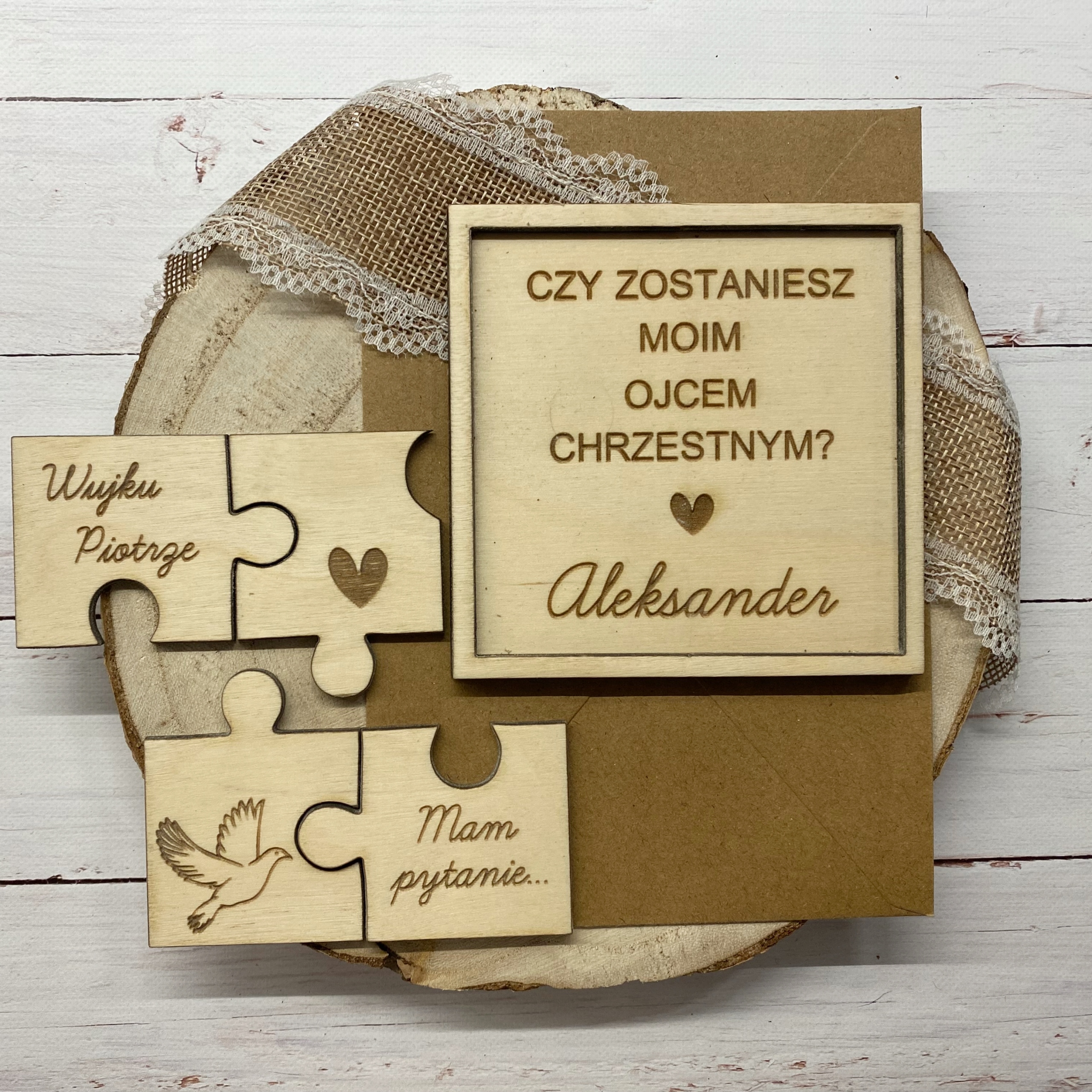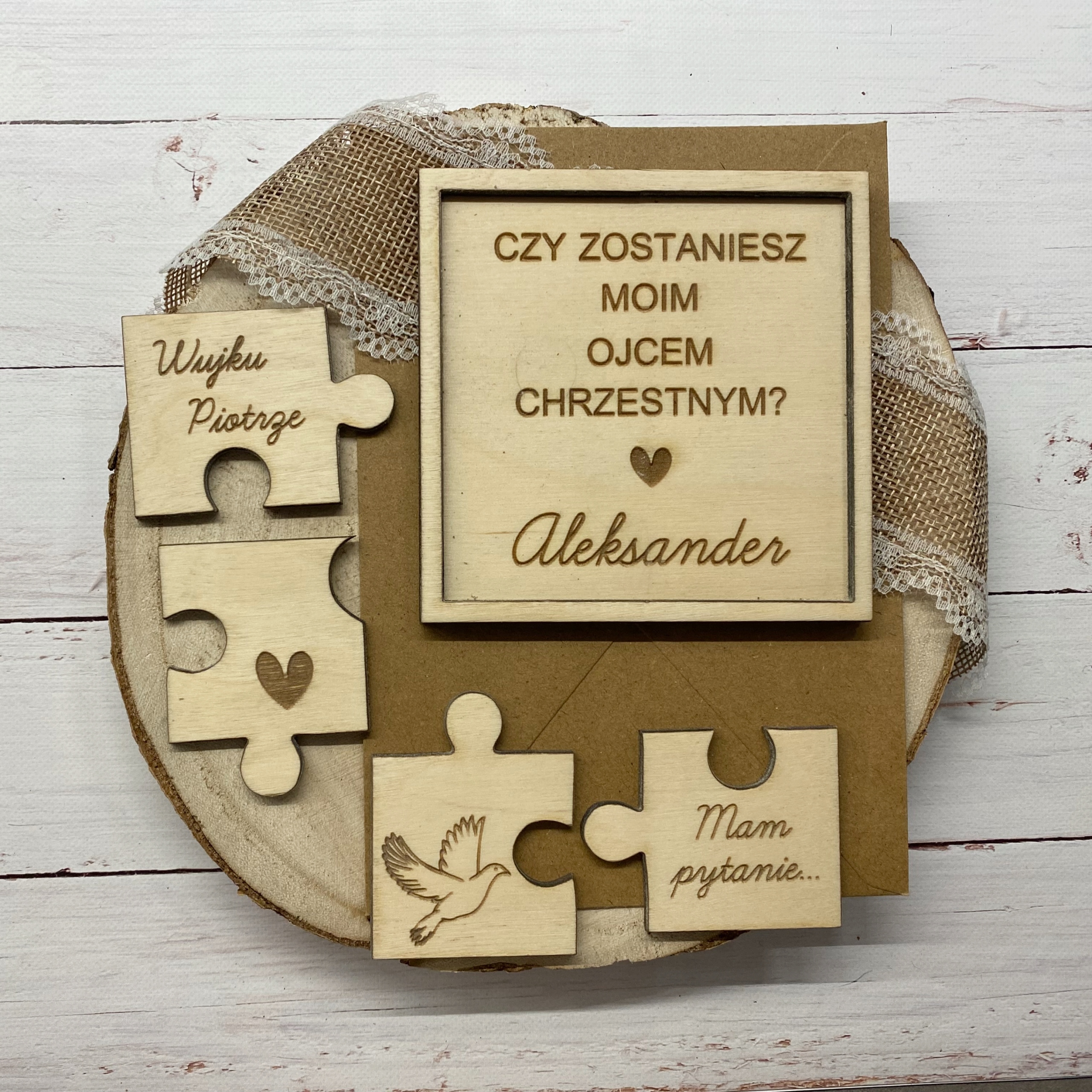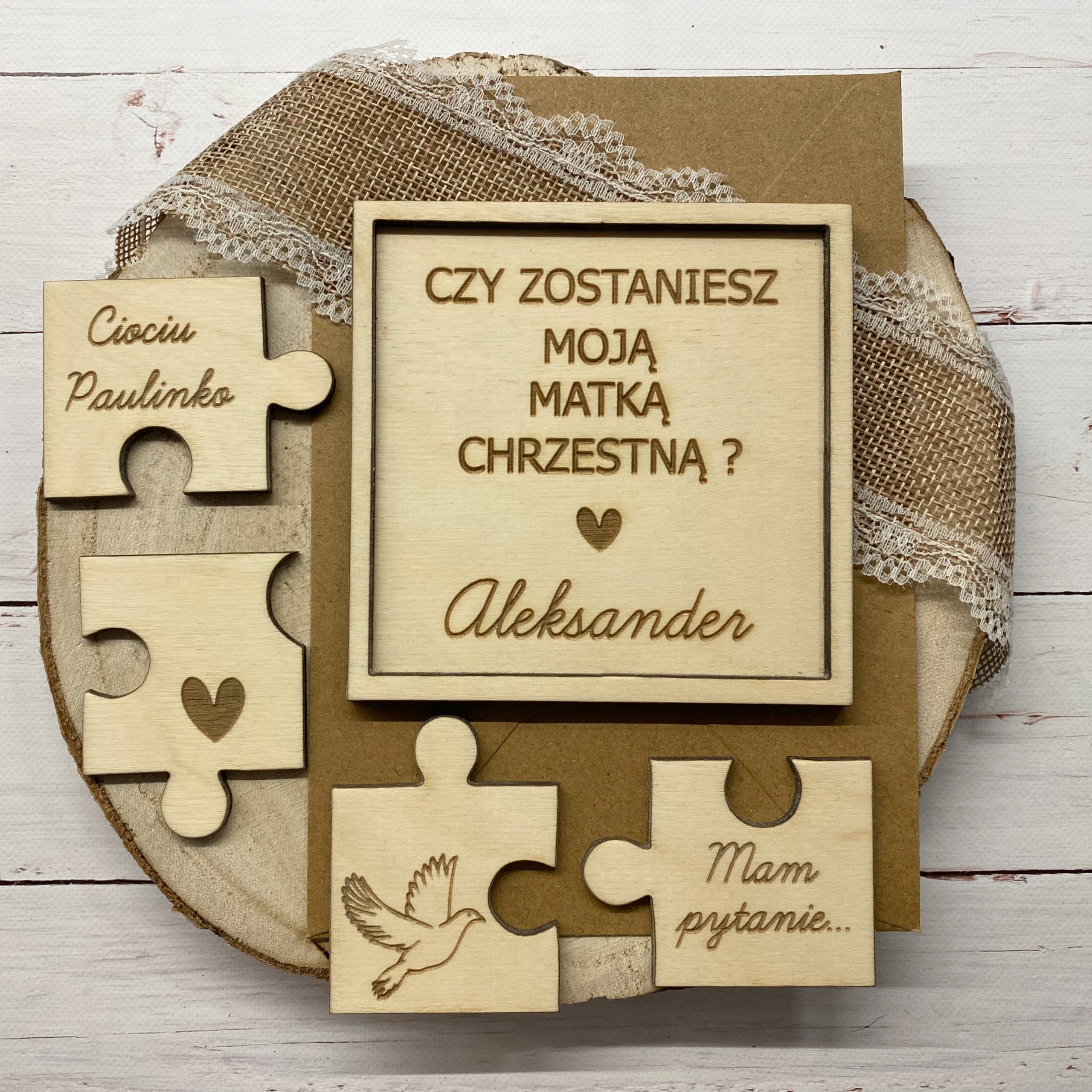 - 4 деревянных пазла с декоративной графикой и именной надписью (укажите имена крестных), например «Тётя Каролинко», «Дядя Марцин» и т. д. + надпись «У меня есть вопрос».