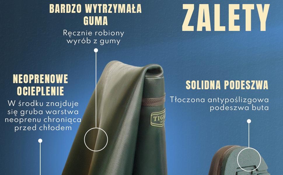 1. Tygar Rubber Waders - это профессиональный продукт для рыболовов, охотников и рыбаков, предназначенный для различных сезонов. У них густой слой неопрена внутри холода. Они обеспечивают высокий комфорт при работе в воде.