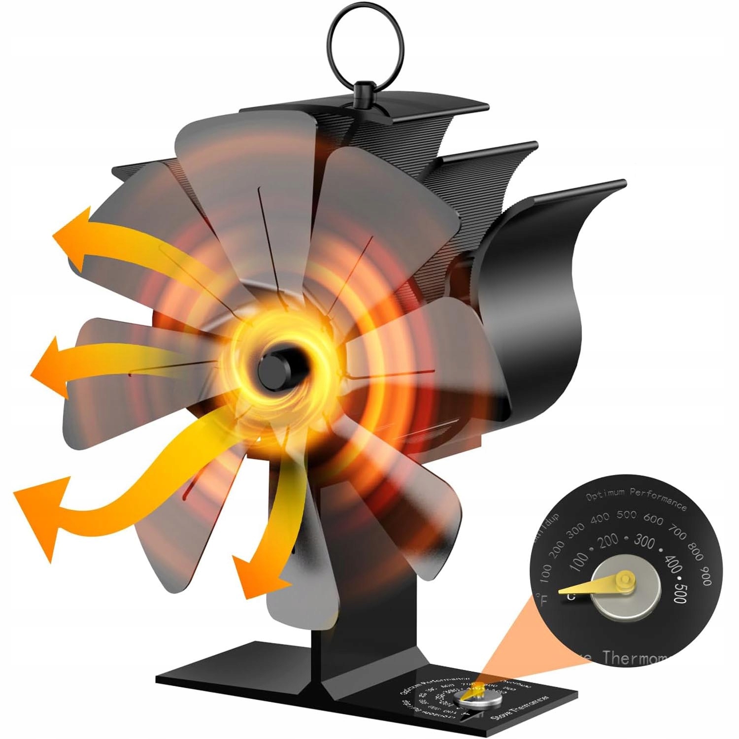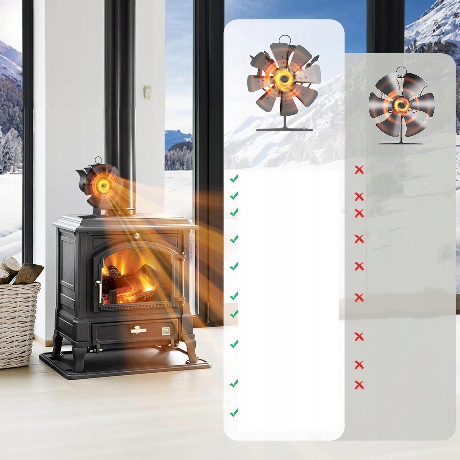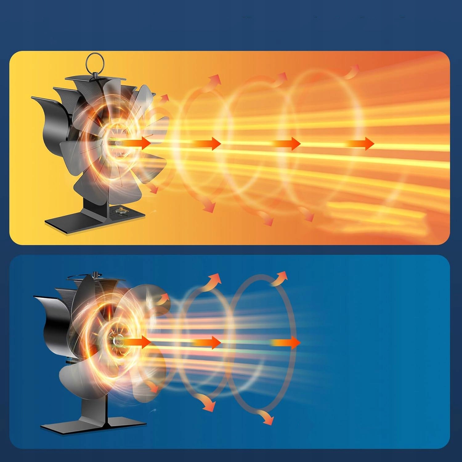 Вентилятор печи использует тепловую энергию для работы и не требует батарей или электричества. Он может поглощать высокую температуру на поверхности камина и преобразовывать ее во вращательную энергию, обеспечивая циркуляцию горячего воздуха по комнате, не позволяя горячему воздуху скапливаться в верхней части комнаты.