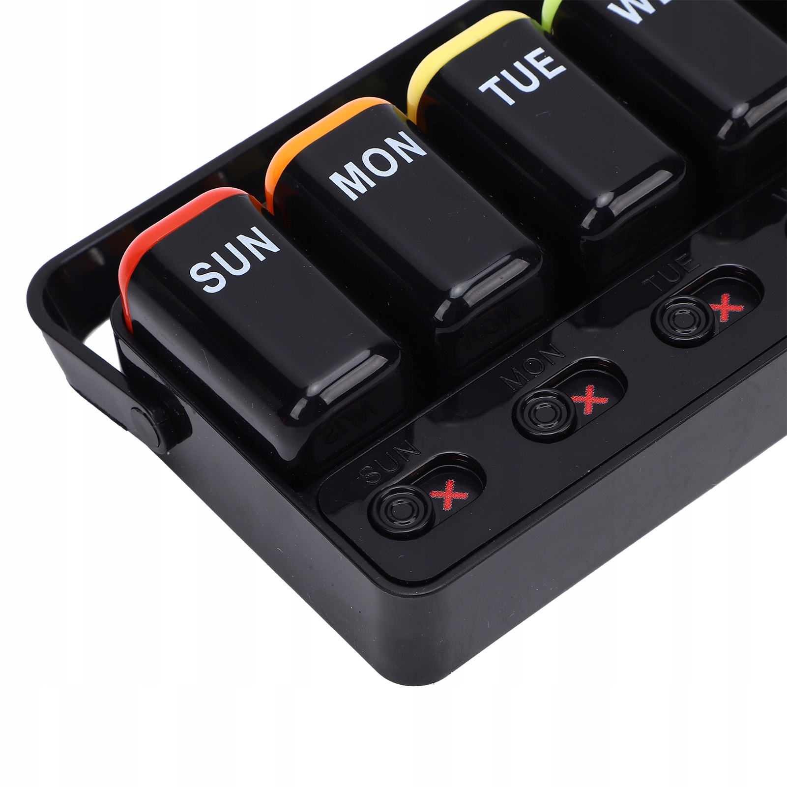 Особенность:1. Встроенное напоминание о приеме лекарств. Еженедельный органайзер для планшетов имеет встроенное отслеживание расписания и напоминания, благодаря чему вы никогда не пропустите дозу. Конструкция сдвижной крышки обеспечивает быстрый доступ к 7 съемным отделениям для организованного ежедневного приема лекарств.