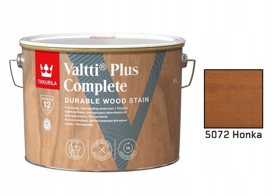 Tikkurila valtti Plus Complete может быть окрашена в несколько десятков цветов из миксера. Двойная барьерная УФ -система - Синергия двух ультрафиолетовых фильтров - гарантирует самую высокую защиту от разрушительного ультрафиолетового излучения, что обеспечивает прочный и равномерный цвет покрытия.