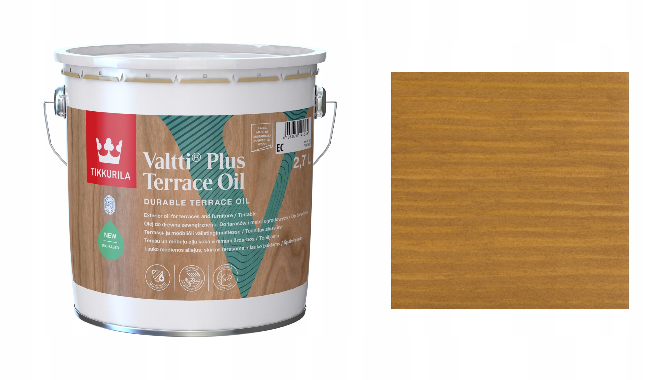 - Tikkurila Valtti Plus Terrace Oil проникает в древесину и создает очень прочную поверхность. В Tikkurila Valtti Plus Terrace Oil 75% общего содержания органического углерода заменено ингредиентами растительного происхождения (маркированы согласно ASTM D6866-18), что составляет 18% по отношению к общему составу продукта.