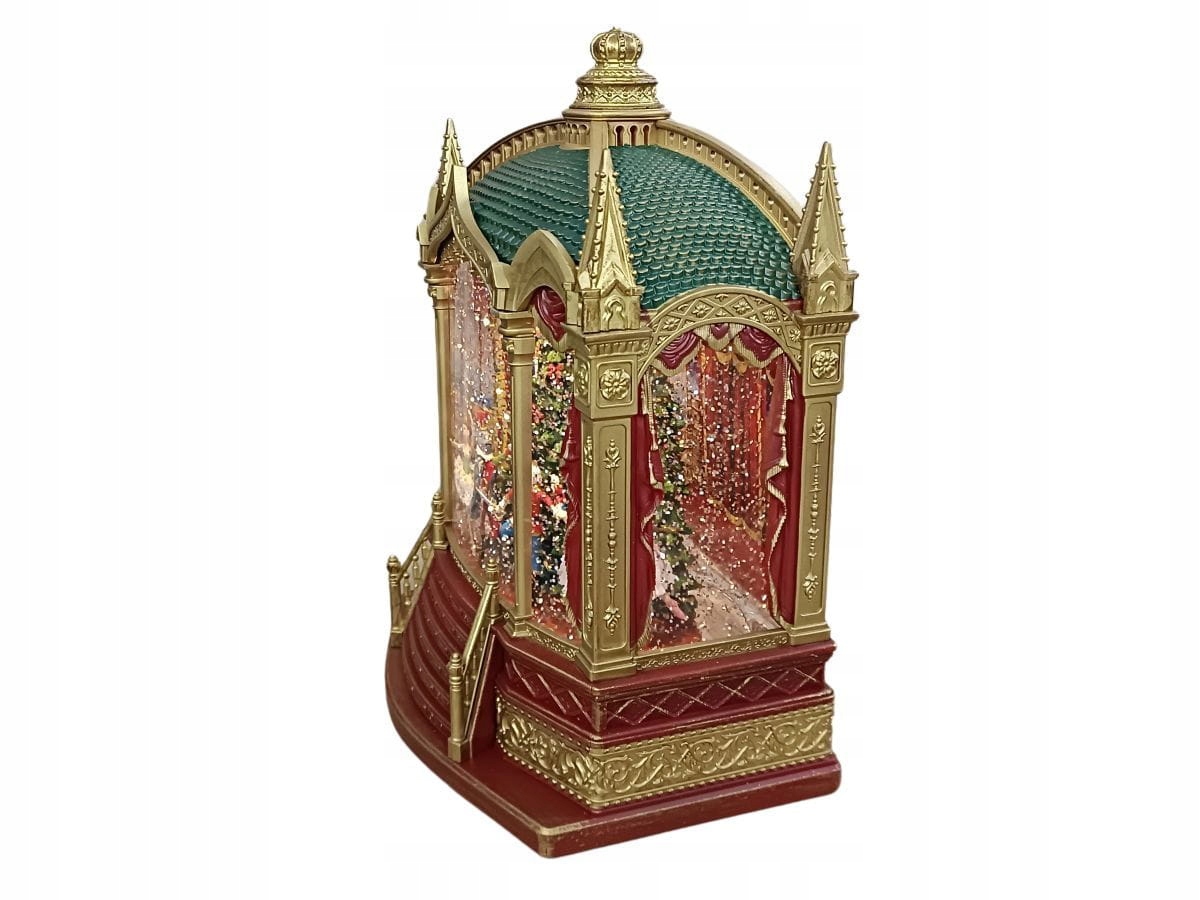 Представляем уникальную сцену/снежный шар, вдохновленную сценами из культового балета «Щелкунчик». Внутри здания театра расположена зимняя декорация с фигурами Щелкунчика, Мышиного короля и двух балерин. Персонажи размещаются вокруг богато украшенной елки. Уникальность этой сцены дополняется кружащимся снегом (глиттером), который активируется переключателем, и теплым светодиодным освещением, подчеркивающим блеск плавающих частиц. Цвета соответствуют природе Рождества: преобладают красный, золотой и зеленый.