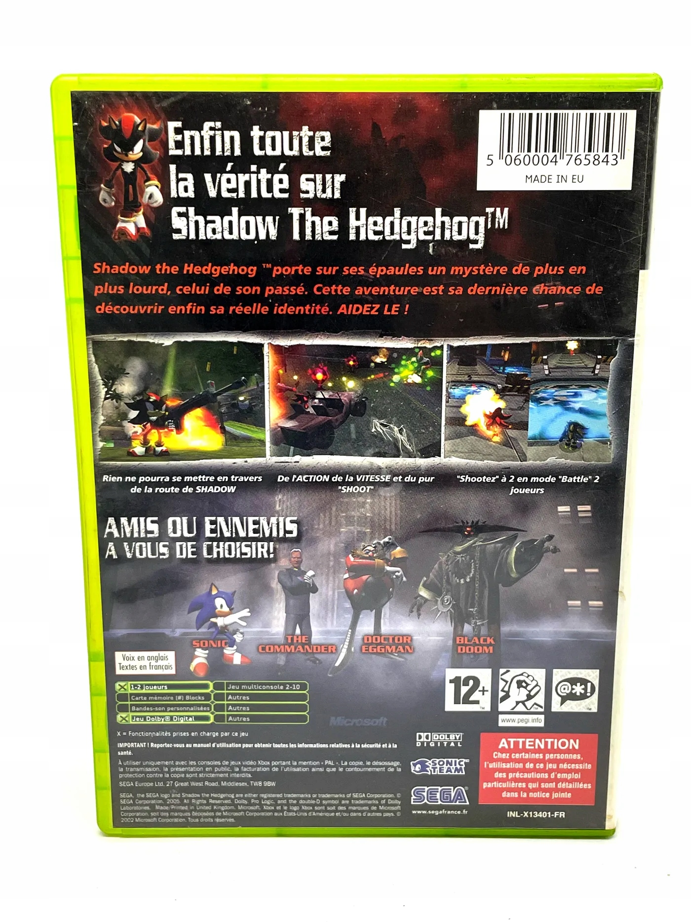 Откройте для себя секреты прошлого Тень в этом побочном Sonic The Hedgehog. Играйте как тень, используя оружие и обувь, плавающие в воздухе, и выберите свой собственный путь в этом полном приключении. Этот предмет находится в очень хорошем состоянии и был протестирован.