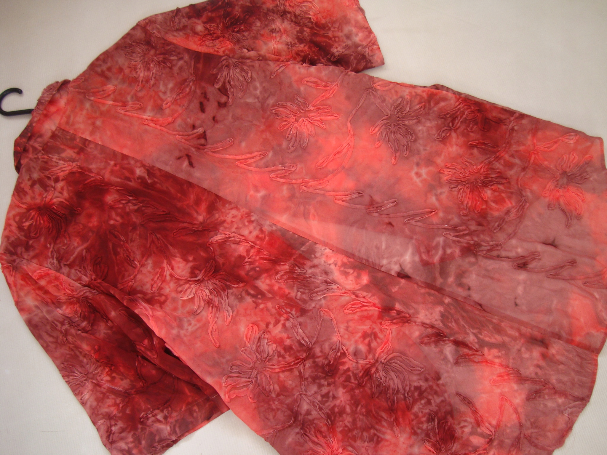 Куртка - накидка, без подкладки и без застежки. Тонкие подушки в руках. На нем пришиты гофрированные цветочки - просто потрясающе!!!