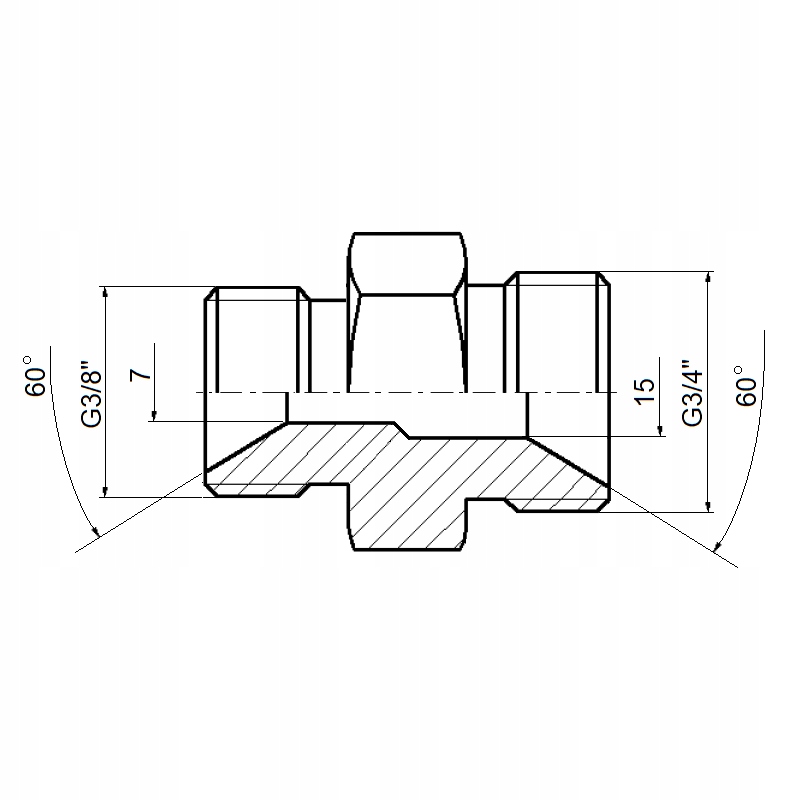 Прямой гидравлический разъем, используемый для соединения двух гидравлических линий или для соединения с другими разъемами. С одной стороны наружная резьба G3/4" с другой стороны дюймовая наружная резьба G3/8"