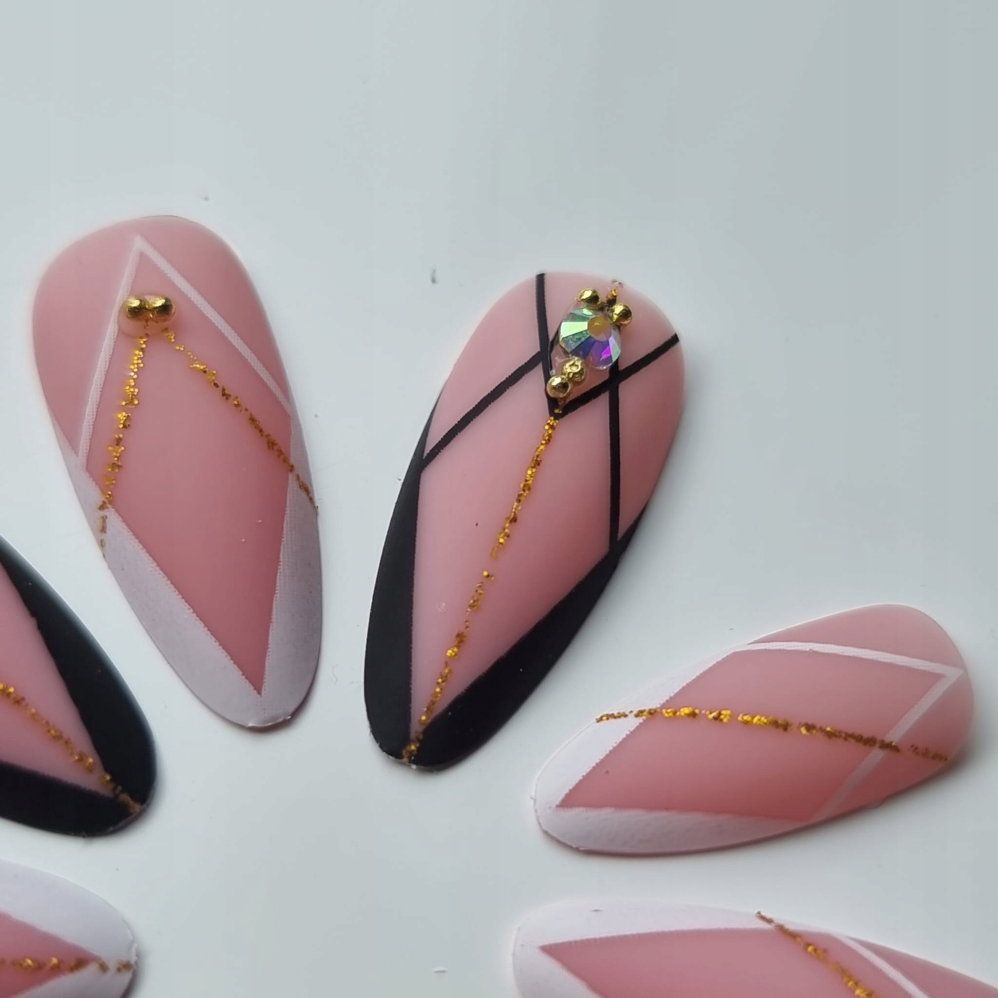 ✔️Выбранная модель в красивом цвете. матовый цвет телесного цвета с декоративным мотивом в виде геометрического французского кончика черно-белого цвета с золотыми акцентами. Неповторимый характер ему придают 3D-украшения из золотых цирконов и гагатов. Ногти миндалевидной формы.