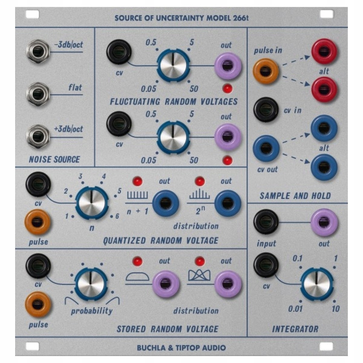 Предлагая массу возможностей для создания уникальных примеров контролируемой случайности, Buchla Model 266t Source of Uncertainty от TipTop Audio представляет собой воссоздание классического генератора случайного напряжения и модуля скульптуры. Возвращая классический набор модулей Buchla 200-й серии, 266t воссоздает шесть различных инструментов в одном классическом интерфейсе, которым может насладиться все сообщество Eurorack. 266t разделен на две секции генерации и модификации, включающие два разных процессора и четыре типа генераторов, один из которых производит три варианта аналогового шума, помеченные как плоский, -3 дБ/октава и +3 дБ/октава.
